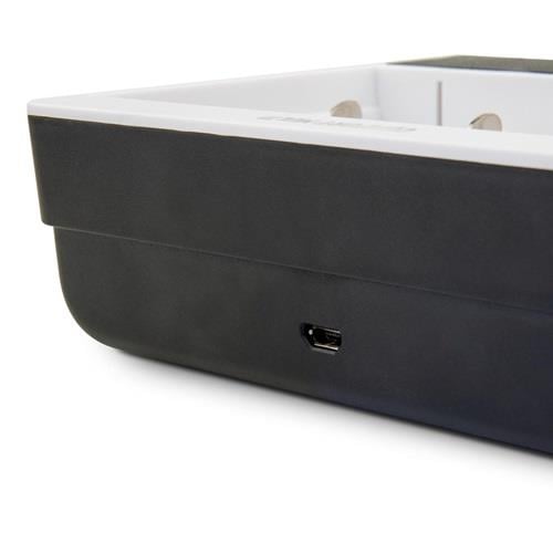 mit USB Eingang für 1-4 NiMH Akkus der Größen Micro AAA / Mignon AA / Baby C / Mono D sowie ein 9V E-Block · mikrocontrollergesteuerte Ladung mit Einzelschachtüberwachung · 3-farbige LED-Anzeige zum Ablesen des Zellen-Status · mit intelligenter "PERFECT 7" Ladetechnologie (Kapazitätsschnelltest, schonende Vorladung, Akku Analyse, Schnellladung, IQ-Abschaltung, Top-Off Ladung, Erhaltungsladung) · für den 9V E-Block gibt es zusätzlich die Funktionen des Kapazitätsschnelltests Weitere technische Eigenschaften: · Ausgangsspannung: 1,2 V NiMH · prüfpflichtig: ja