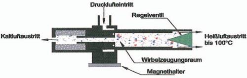 zur punktuellen Kühlung von Metall- und Kunststoffteilen an Werkzeugmaschinen zur Kühlung mit Kaltluft an Stellen, an denen keine Schmier- oder Kühlflüssigkeiten erwünscht sind erzeugt sowohl Kalt- als auch Heißluft Das Zubehör besteht aus dem flexiblen ARIANA-Cool-Line-System (1/2″) sowie aus einer Magnetplatte, Kugelhahn, Gewindetülle für Schnellkupplung sowie einem Schalldämpfer. Anwendung: Die Kaltluftdüse wird an Druckluft angeschlossen, bzw. mit Druckluft betrieben. Nach der Funktionsweise des Wirbelrohrprinzips rotieren innerhalb der Kaltluftdüse zwei gegenläufige Luftströme. Der Kaltluftaustritt erfolgt am blauen Bauteil, der Heißluftaustritt am roten Bauteil. Einstellung von Volumenstrom und Kaltluftanteil durch Verstellschraube. Anschlussgewinde: 44411 ″ Betriebsdruck: 44411 bar nutzbare Kaltluft: bis ca. -30 °C Heißluftaustritt: bis 60 °C Marke: ARIANA