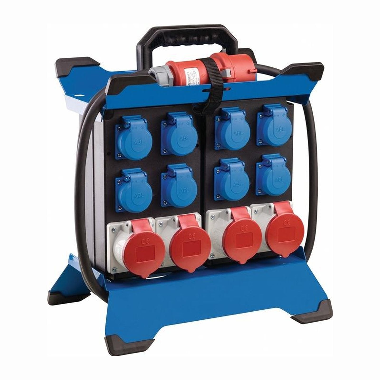 robustes Gehäuse aus hochbruchfestem Spezialkunststoff stabiles Metallgestell mit Kantensschutz mit großem, ergonomischem Tragegriff und Kabelaufwickler Abmessungen (BxHxT): 400x450x252 mm geprüft nach DIN VDE 0620-1, IEC 60309, EN 61439-4, DIN EN 50525-2 fremdkörper und spritzwassergeschützt, zur dauerhaften Verwendung im Außenbereich geeignet IP44