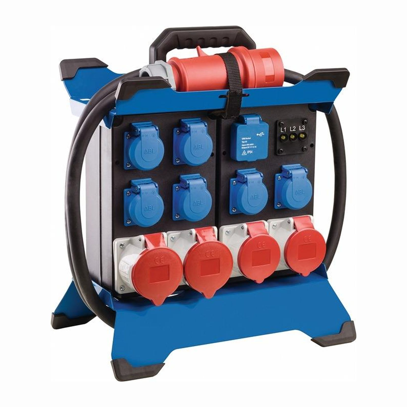| Ausgang: | 6xSteckdose 230V / 2xCEE 400V, 16 A / 2xCEE 400V, 32 A / 2xUSB-Ports 5V / 2,1 A / mit Phasenanzeige L1, L2, L3 |