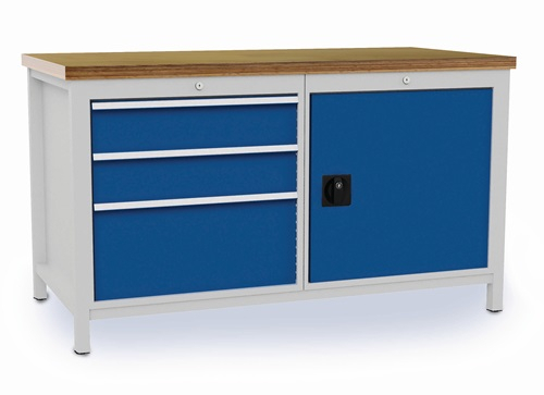 "BEDRUNKA+HIRTH Werkbank signalblau lichtgrau B1500xH859xT750mm Buche Multipl.40mm 3 Schub.1 Tür - 03.15.17VA 7035/5005"