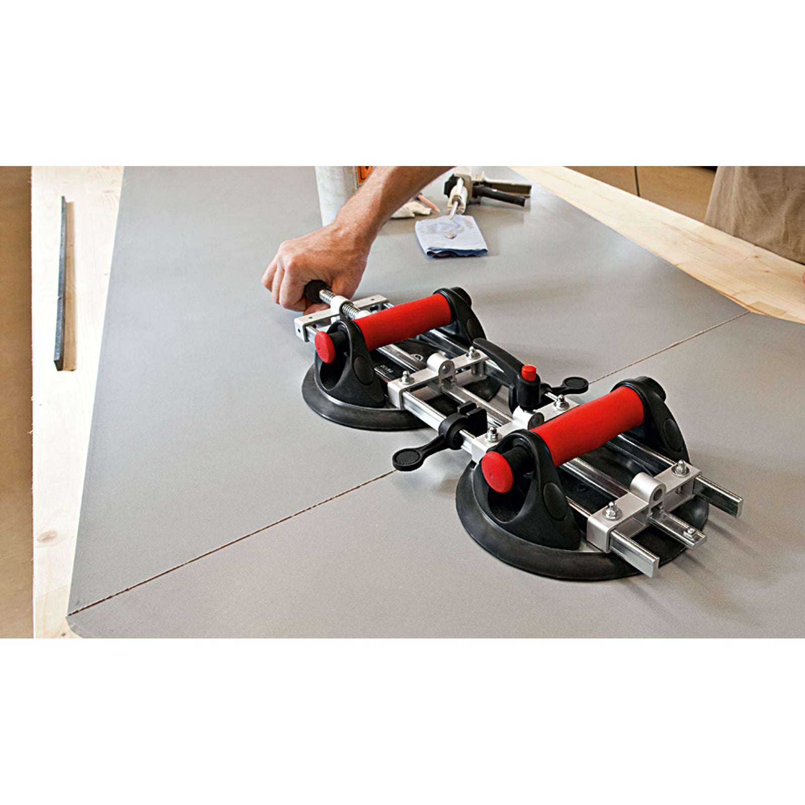 - Zum Verspannen und Positionieren großflächiger, auch schwererer Bauteile mit glatter Oberfläche, wie z. B. Kunststein, Keramik, Granit, Corian®, Kunststoff, Blech und Glas