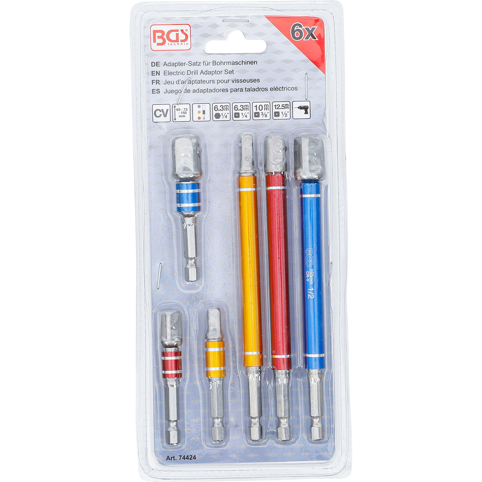 "BGS Adapter-Satz für Bohrmaschinen farbig Antrieb Außensechskant 6,3 mm (1/4") Abtrieb Außenvierkant 6,3 mm (1/4") / 10 mm (3/8") / 12,5 mm (1/2") 75 - 150 mm 6tlg. - 74424"