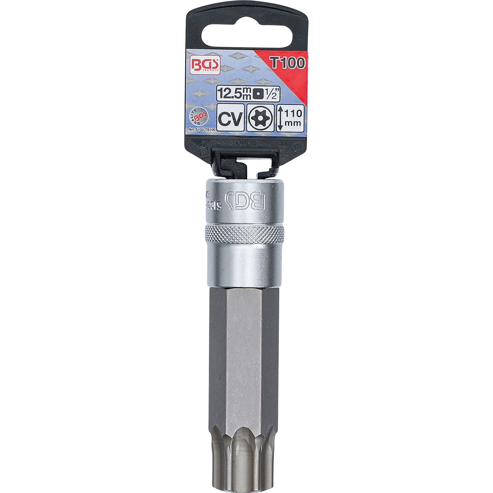 "BGS Bit-Einsatz Länge 110 mm Antrieb Innenvierkant 12,5 mm (1/2") T-Profil (für Torx) mit Bohrung T100 - 5103-TB100"