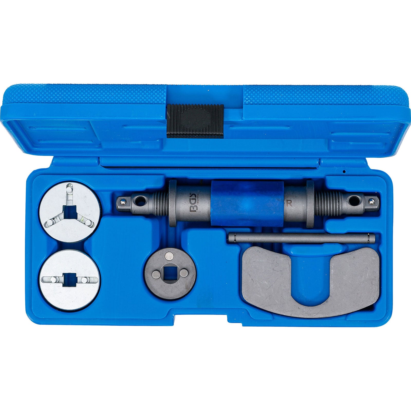 - 1x BGS magnetische Adapterplatte zur Aufnahme von üblichen Bremskolbenadaptern mit feststehenden Stiften