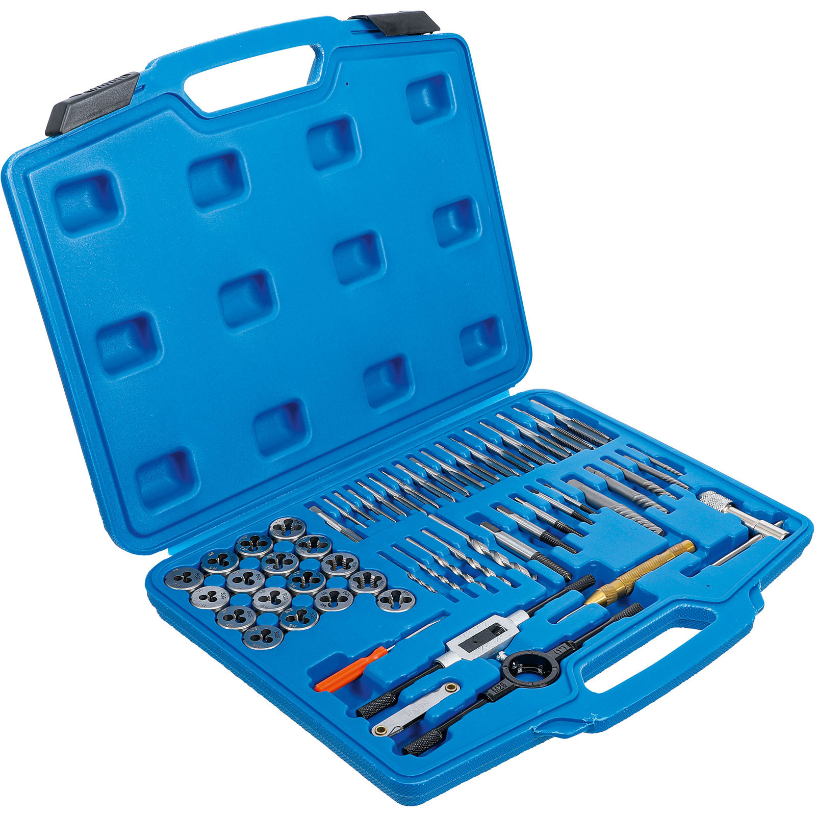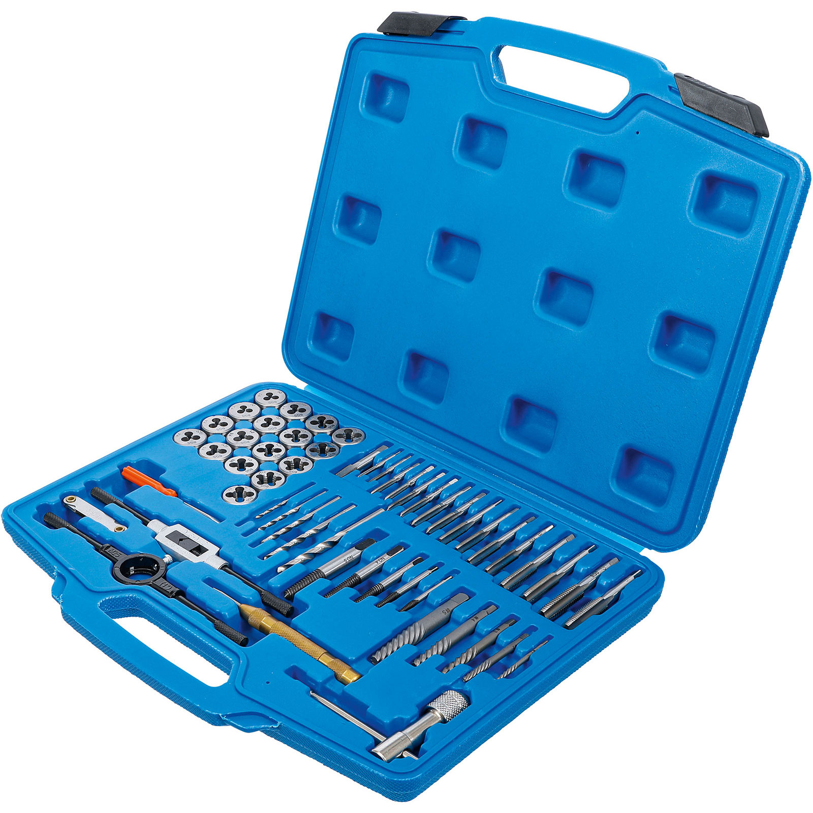 - 17 Gewindebohrer für Innengewinde und 17 Schneideisen für Außengewinde in den Größen: