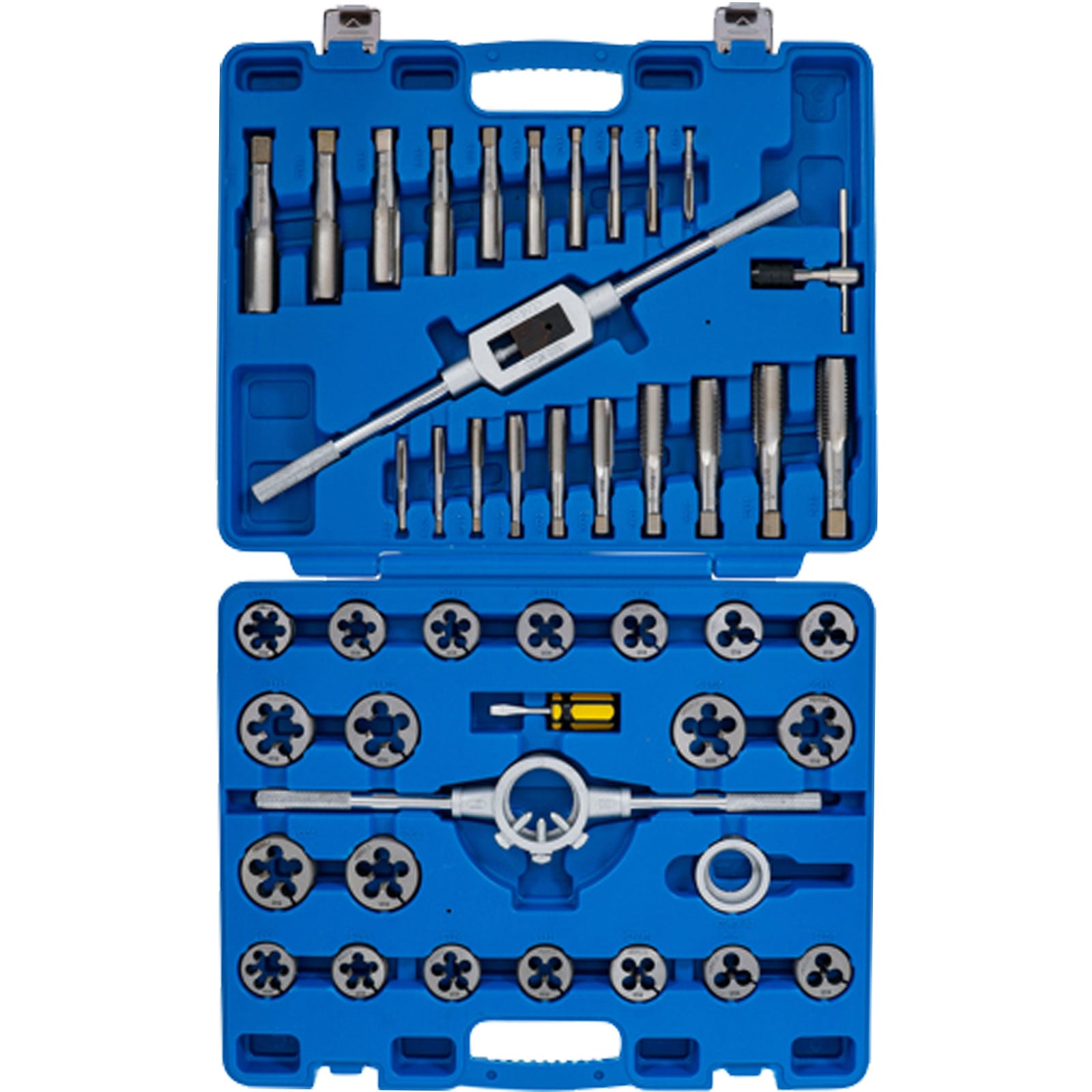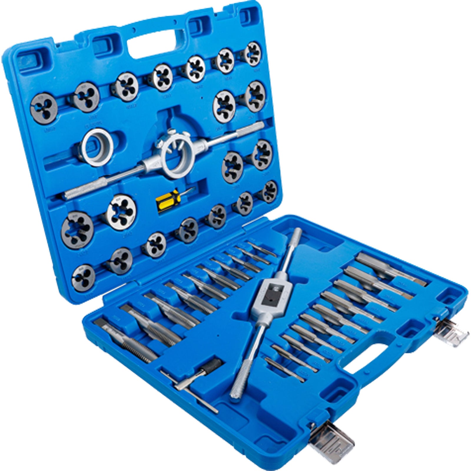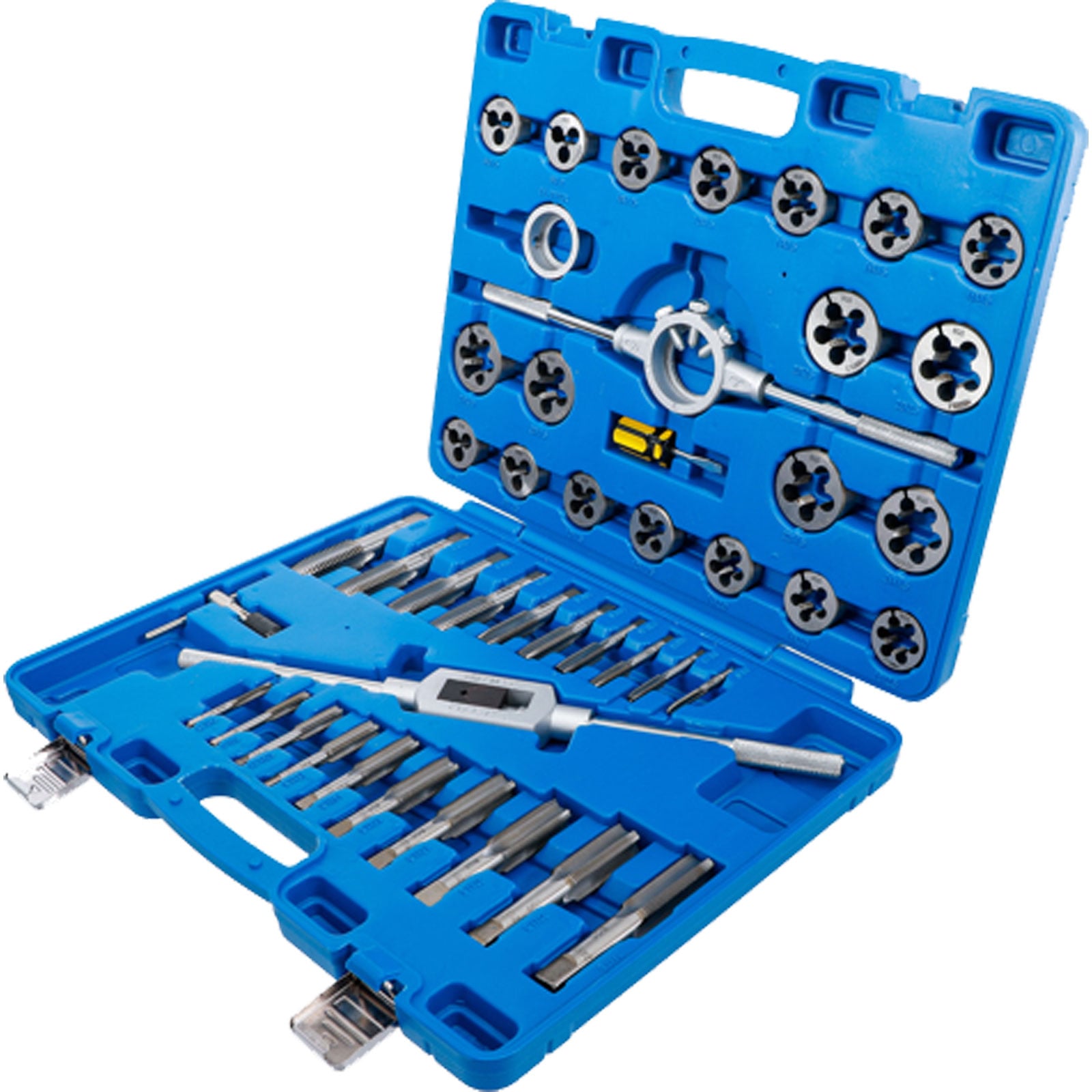 - 20 Gewindebohrer für Innengewinde und 20 Schneideisen für Außengewinde (1x je Größe)M6 x 0,75 - M8 x 1,0 - M6 x 1,0 - M8 x 1,25 - M10 x 1,25 - M10 x 1,50 - M12 x 1,50 - M14 x 1,50 - M16 x 1,50 - M18 x 1,50 - M20 x 1,50 - M22 x 1,50 - M24 x 1,50 - M12 x 1,75 - M14 x 2,0 - M16 x 2,0 - M18 x 2,5 - M20 x 2,5 - M22 x 2,5 - M24 x 3,0