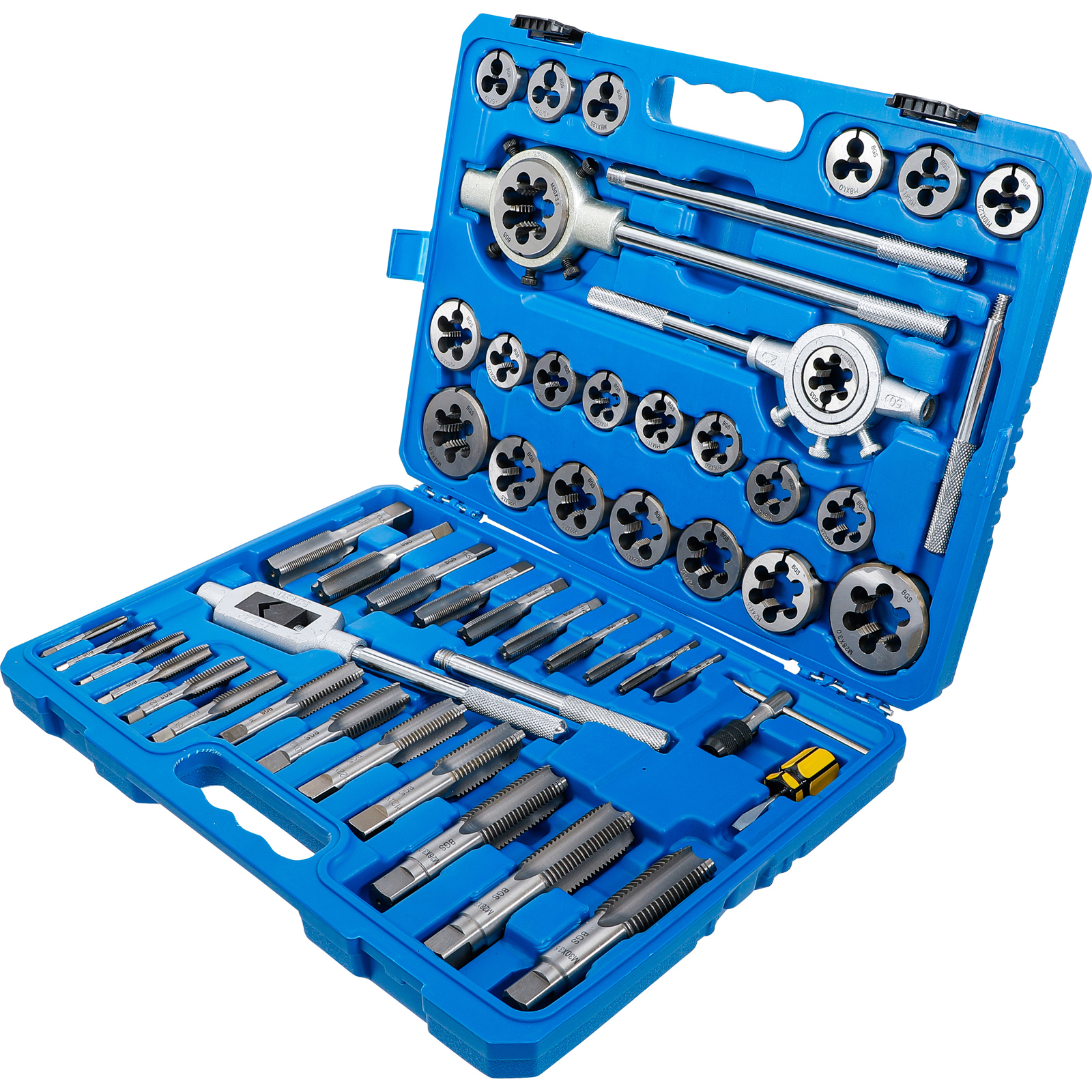 - 23 Gewindebohrer und 23 Schneideisen, M6 x 1,0, M6 x 0,75, M8 x 1,25, M8 x 1,0, M10 x 1,5, M10 x 1,25, M12 x 1,75, M12 x 1,5, M14 x 2,0, M14 x 1,5, M16 x 2,0, M16 x 1,5, M18 x 2,5, M18 x 1,5, M20 x 2,5, M20 x 1,5, M22 x 2,5, M22 x 1,5, M24 x 3,0, M24 x 1,5, M26 x 3,0, M28 x 3,0, M30 x 3,5
