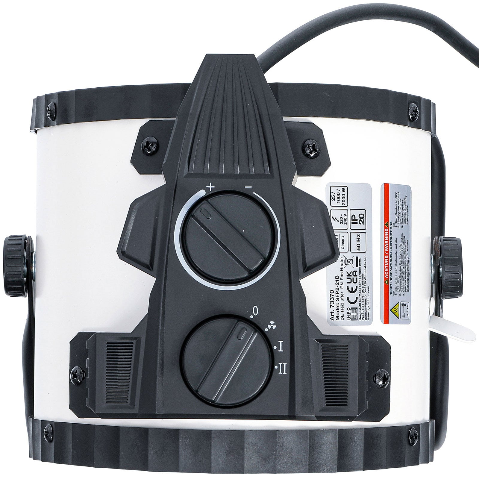 - 2 Heizstufen (1000 / 2000 W) und Ventilatorbetrieb