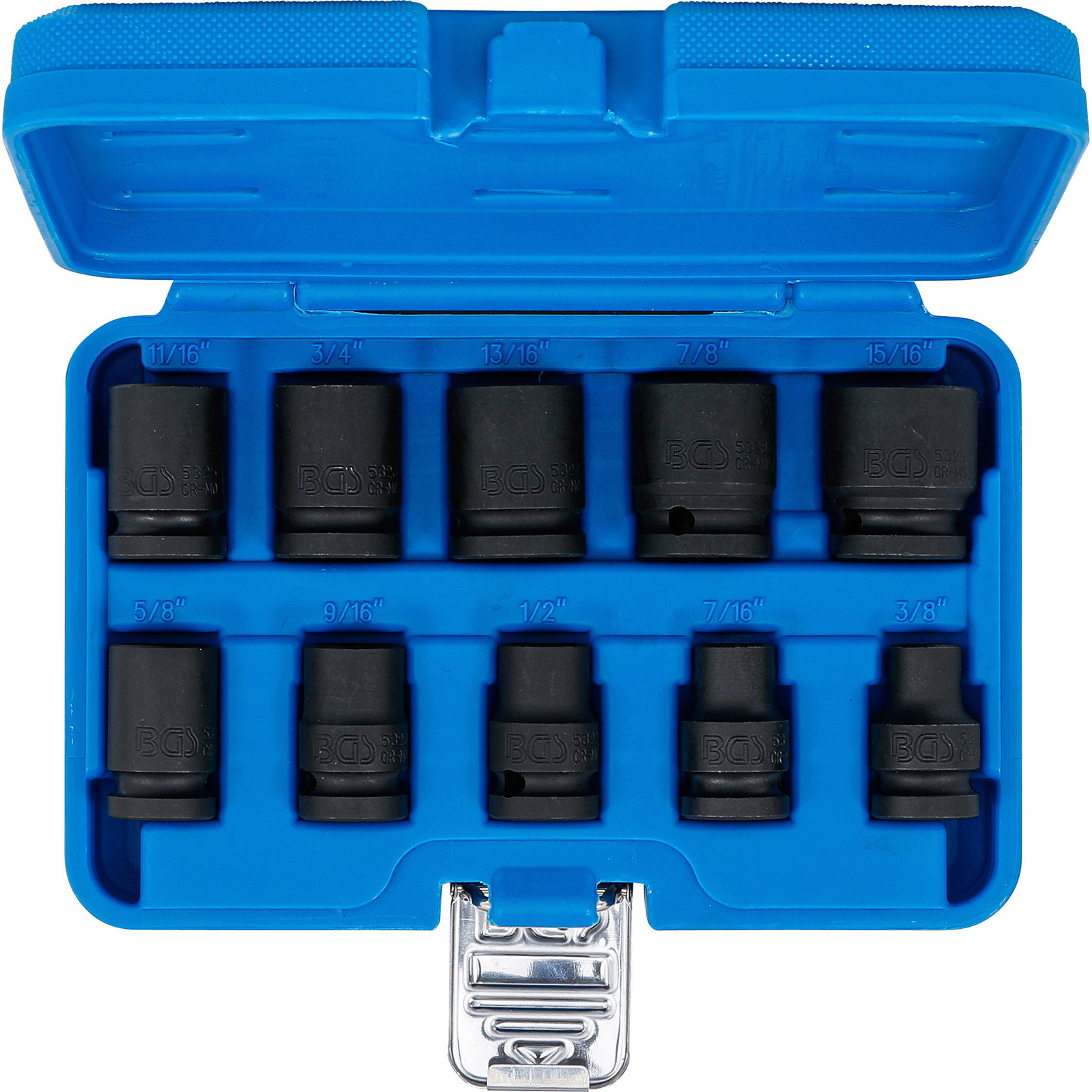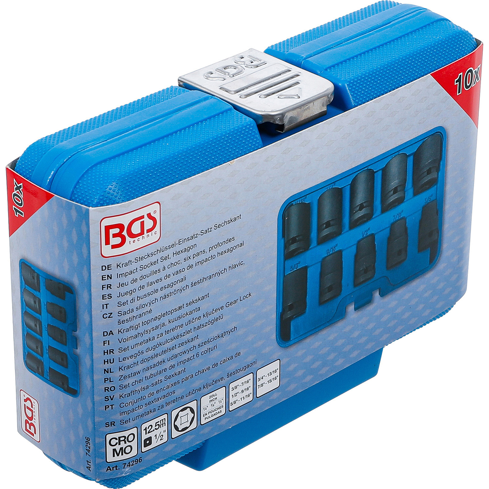 "BGS Kraft-Steckschlüssel-Einsatz-Satz Sechskant Antrieb Innenvierkant 12,5 mm (1/2") SW 3/8 - 15/16" Zollgrößen 10tlg. - 74296"