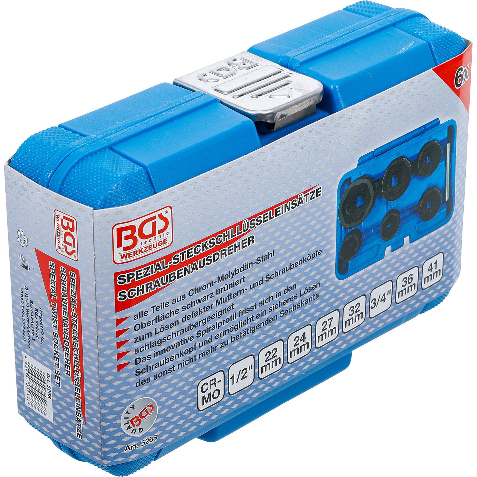 "BGS Spiral-Profil-Steckschlüssel-Satz / Schraubenausdreher Antrieb Innenvierkant 12,5 mm (1/2") + 20 mm (3/4") SW 22 - 41 mm 6tlg. - 5268"