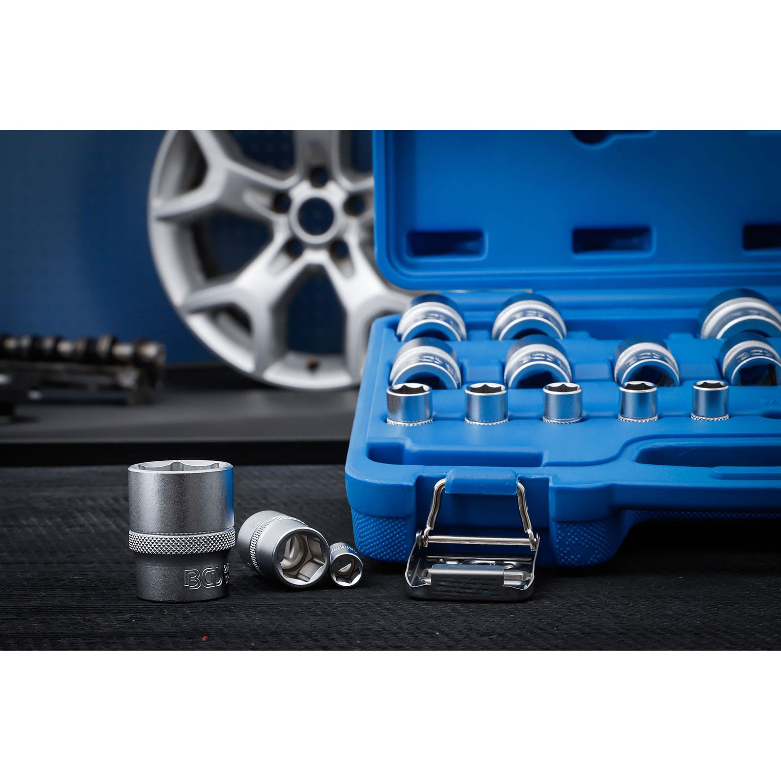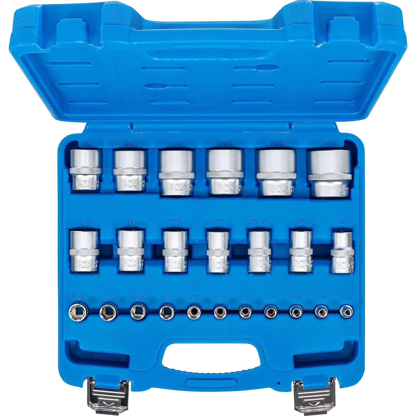 - Steckschlüssel-Einsätze Sechskant, Antrieb Innenvierkant 12,5 mm (1/2"): SW 1/2" - 9/16" - 19/32" - 5/8" - 11/16" - 3/4" - 13/16" - 7/8" - 15/16" - 1" - 1.1/16" - 1.1/8" - 1.1/4"