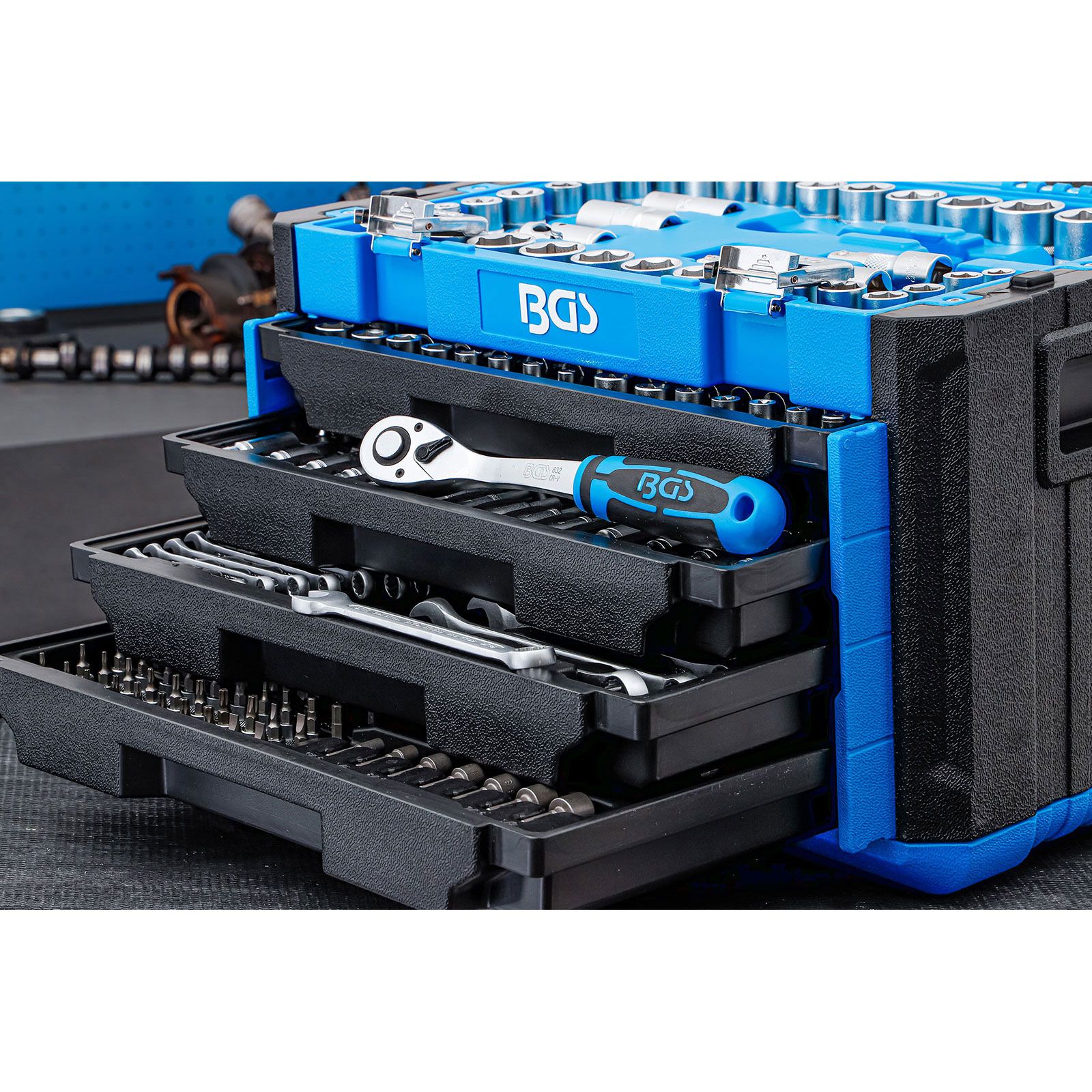 - Steckschlüssel-Einsätze, Verlängerungen, Umschaltknarren, Drehgriff und Maul-Ringschlüssel gefertigt aus Chrom-Vanadium Stahl