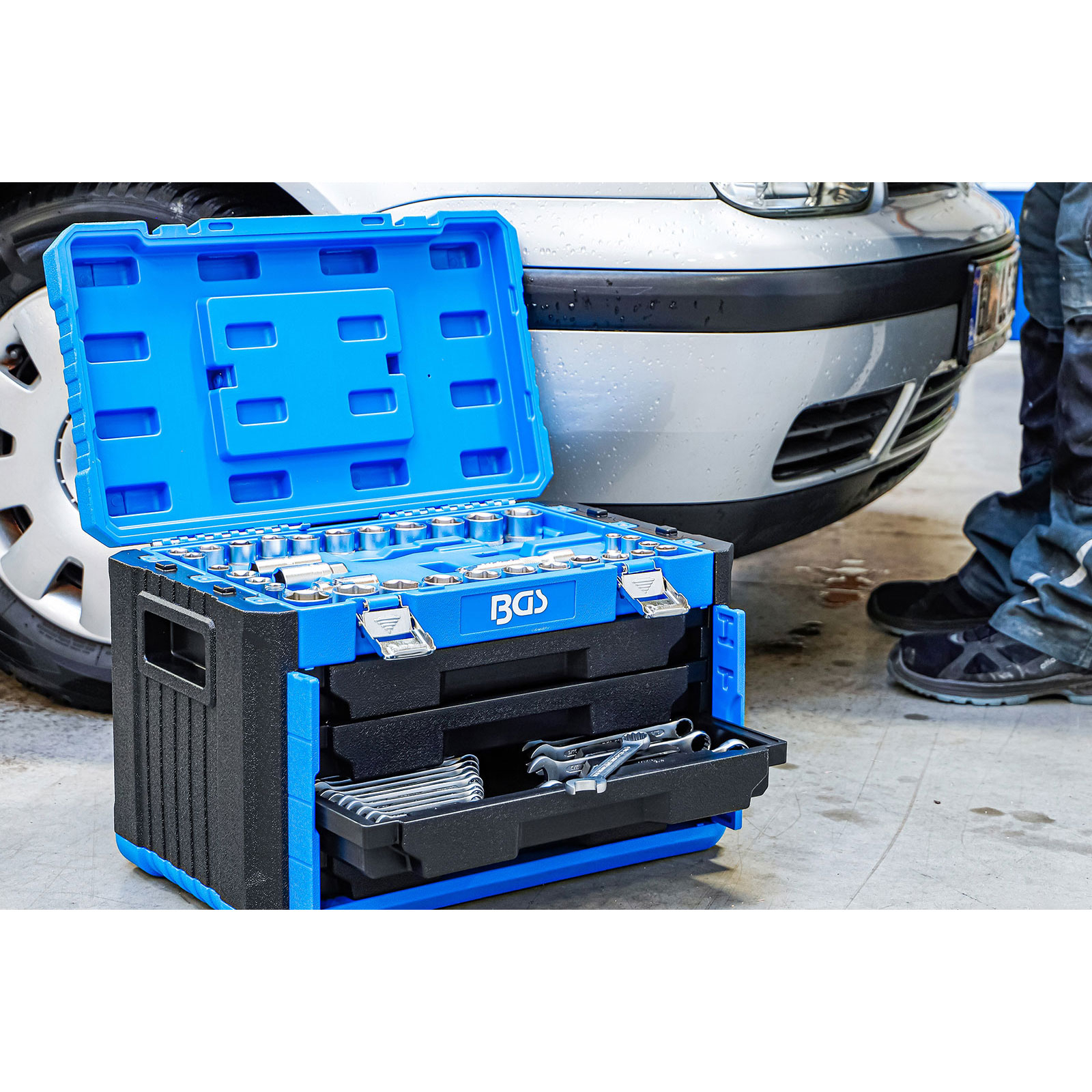 - mit 4 Kunststoff-Schubladen und einer fixierten Werkzeugeinlage im oberen Bereich