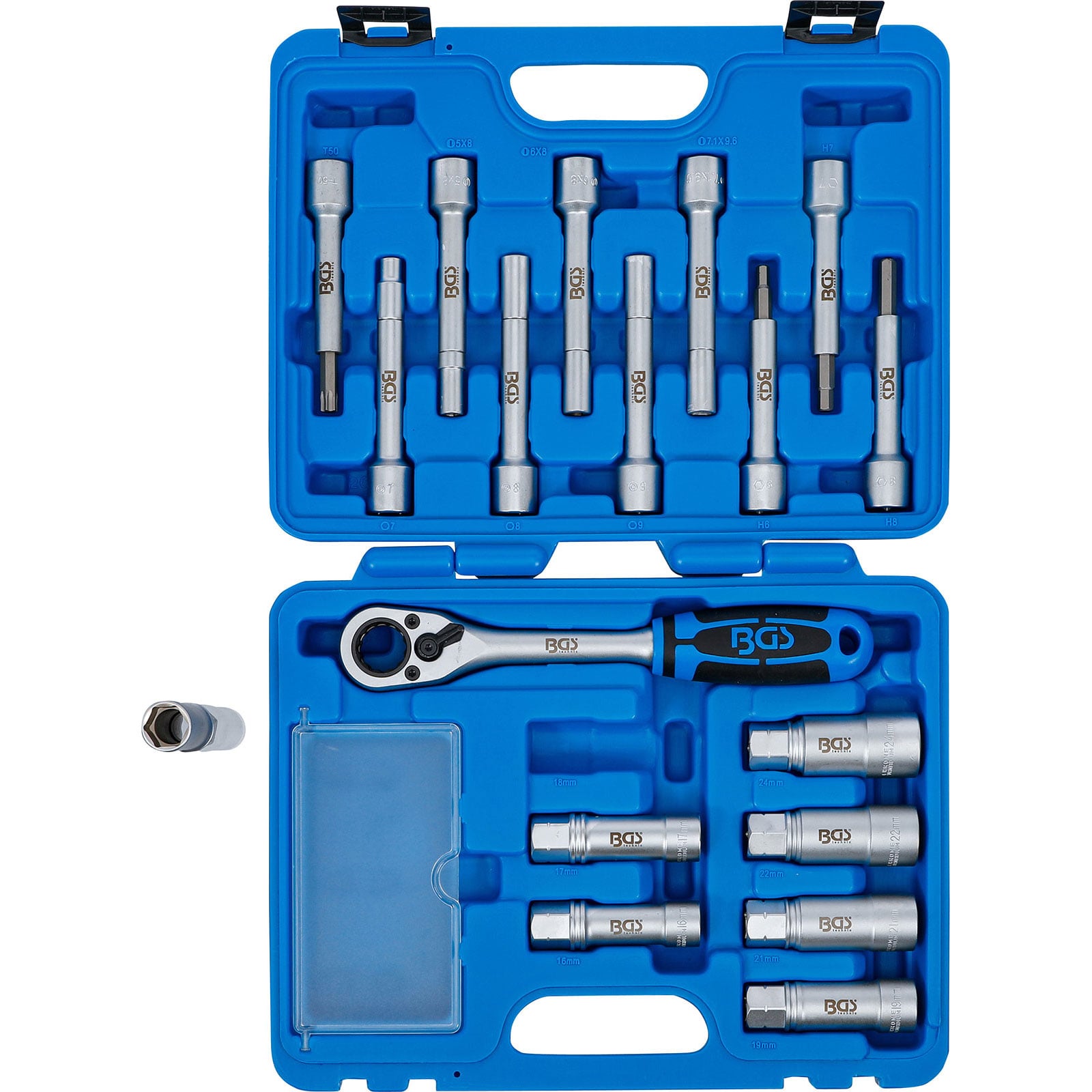 - 7 x Steckschlüssel-Einsätze Sechskant, tief, Antrieb Innenvierkant 12,5 mm (1/2") und Außensechskant SW 21 mm, SW 16 - 17 - 18 - 19 - 21 - 22 - 24 mm