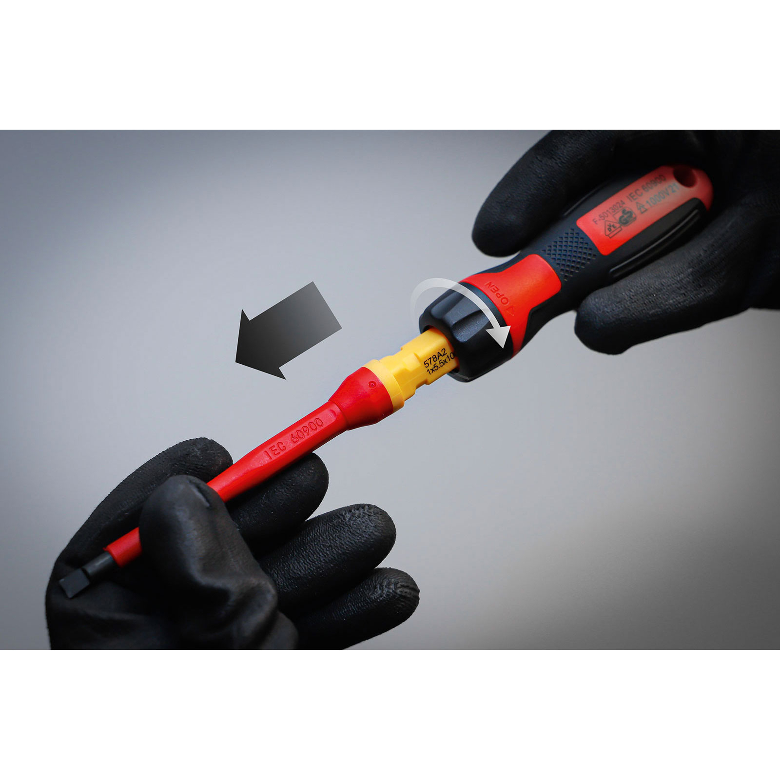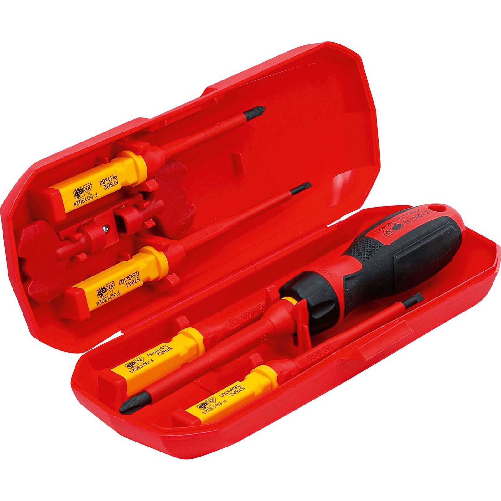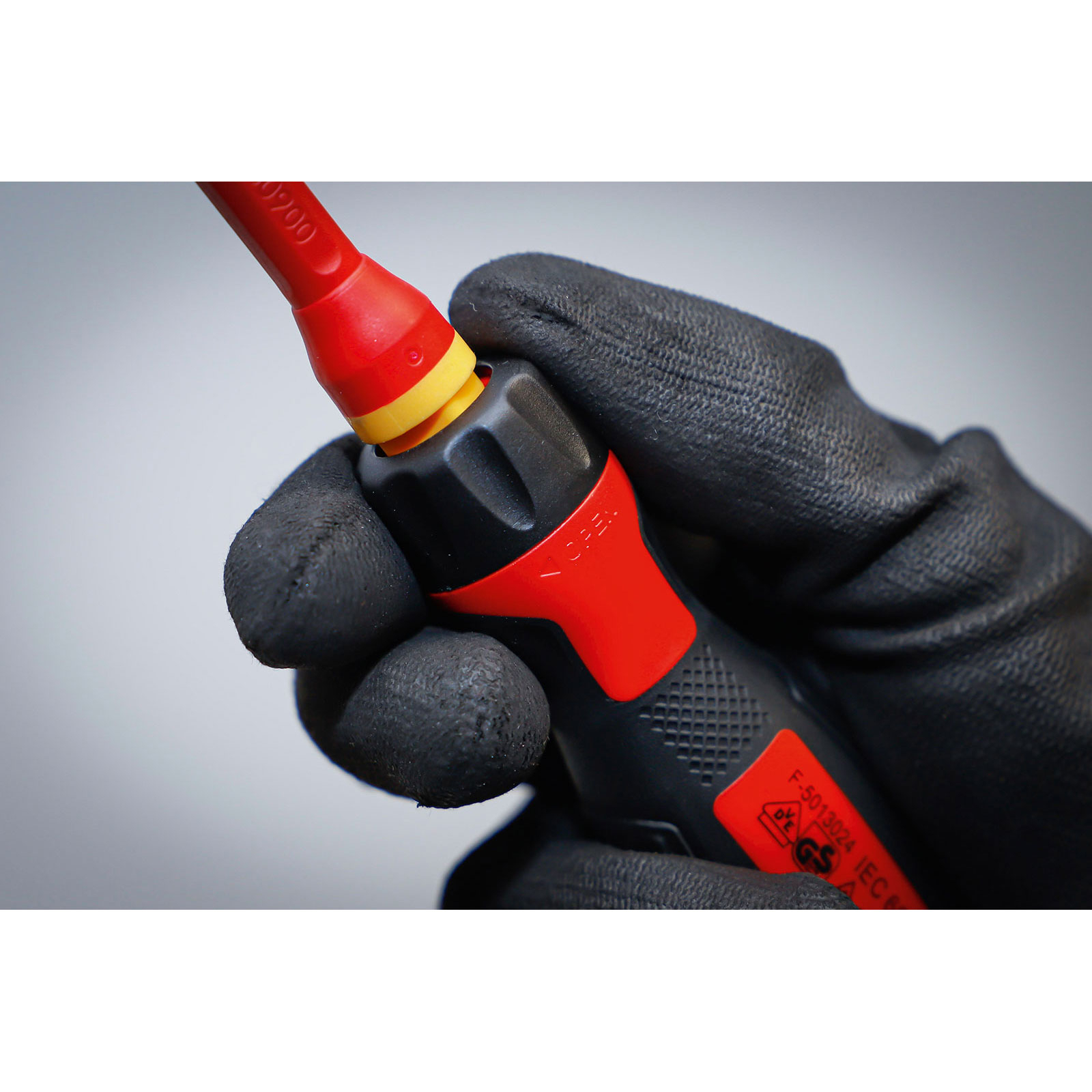 - 1 VDE-Handgriff mit Wechselklingenaufnahme, mit 2-Komponenten-Griff (rot/gelb)
