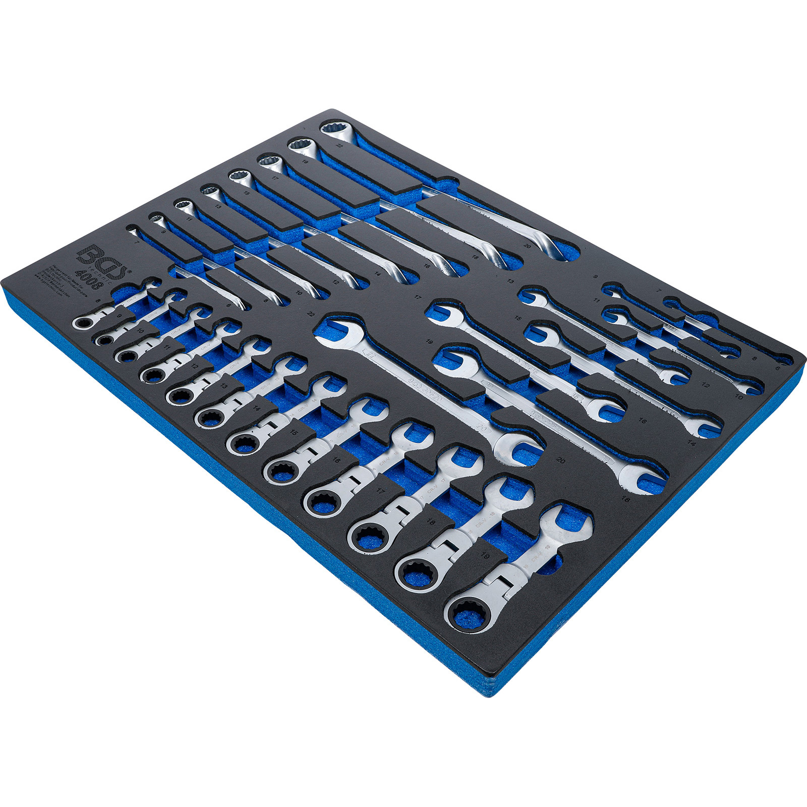 - 1x BGS Werkstattwageneinlage 3/3: Doppel-Maulschlüssel Doppel-Ringschlüssel Ratschenring-Maulschlüssel abwinkelbar 28tlg., bestehend aus: