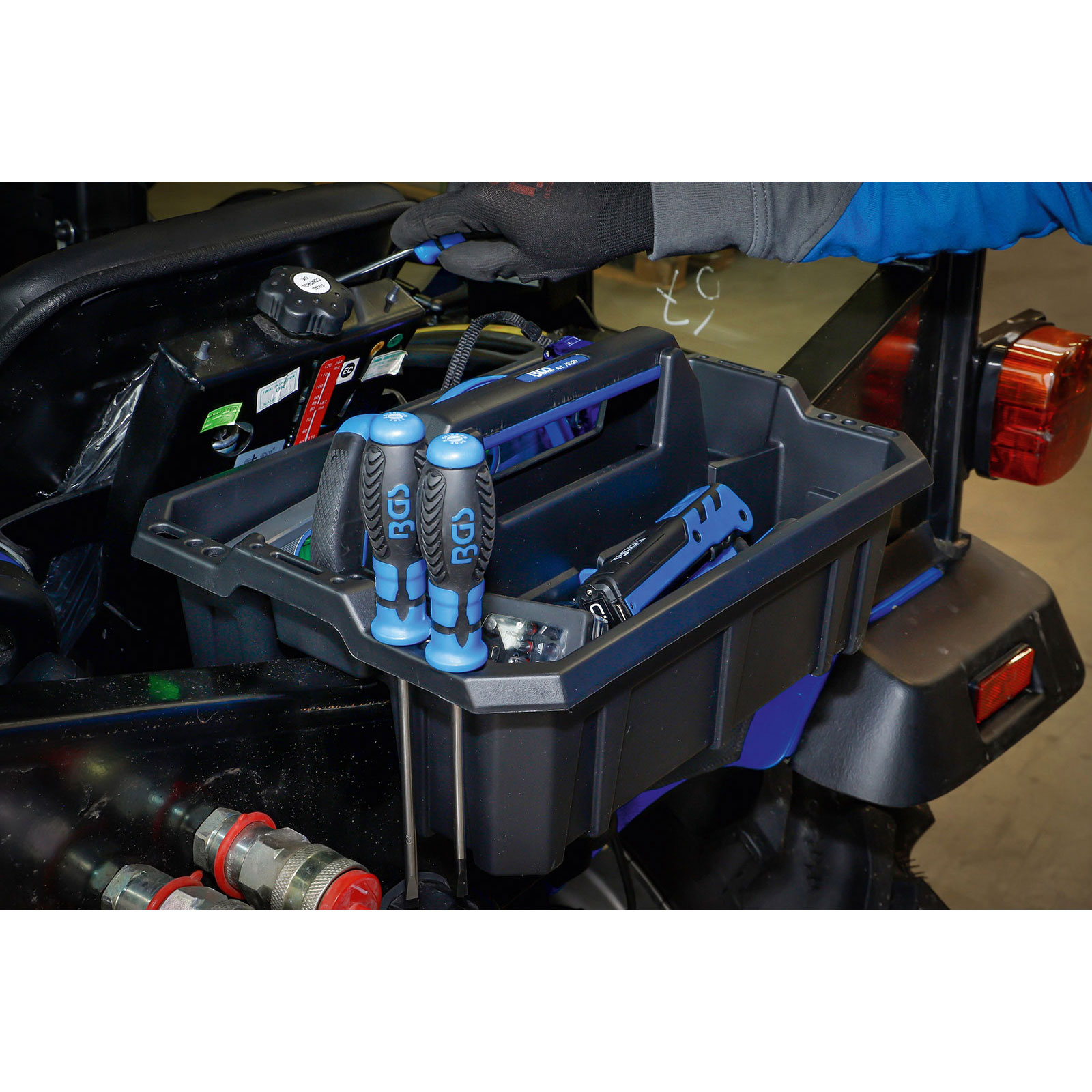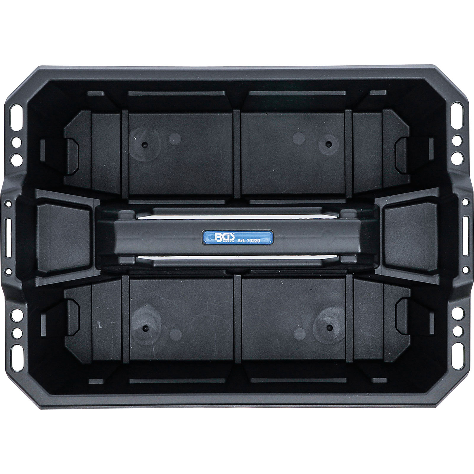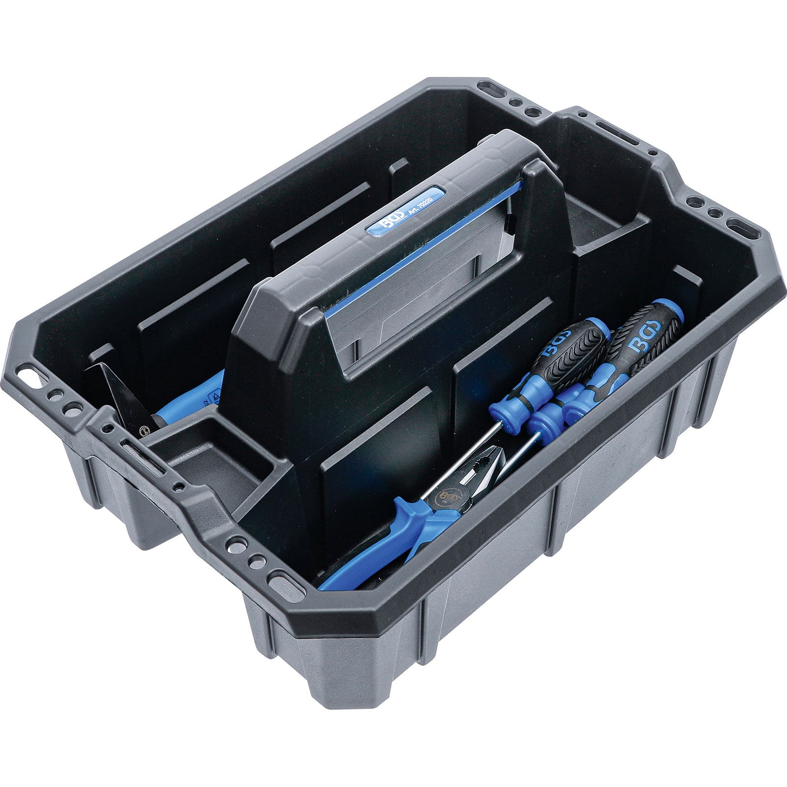 - offener Tragekasten mit zwei großen Einzelfächern zum Transport von Werkzeugen und Kleinteilen