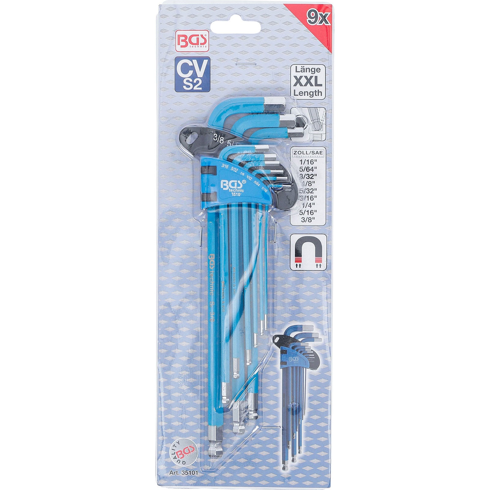"BGS Winkelschlüssel-Satz extra lang Innensechskant Zollgrößen 9tlg. - 35101"