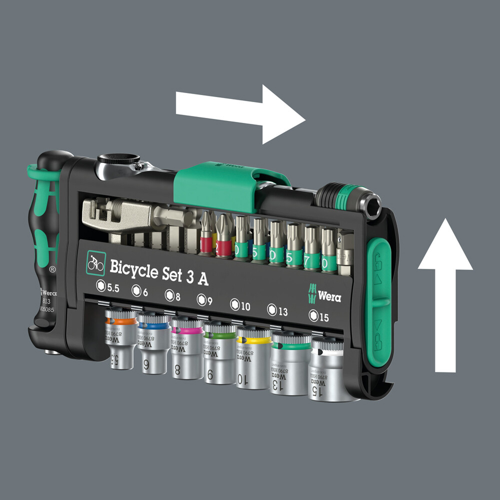 kompaktes 38-teiliges Fahrradwerkzeug-Set in Tasche für Werkstatt und on tour · Tool-Check mit grünen Verriegelungselementen zur Sicherung der Werkzeuge · mit kleiner Soft-Tasche zum Mitnehmen einzelner Werkzeuge · mit Kettennieter und -halter mit auswechselbarem Nietstift zum Öffnen und Schließen von Fahrradketten · geeignet für Single-Speed Ketten, bis 12-fach · Werkzeuge für die gängigsten Schraubenprofile bei Straßenfahrrädern, Mountainbikes und E-Bikes · inklusive zwei Reifenhebern mit Zusatzfunktionen · robuste, oberflächenschonende, kompakte textile Tasche mit geringem Gewicht · Inhalt: 1 Bit-Ratsche ¼“, 1/4“ x 87 mm 1 Bits-Handhalter, 1/4“ x 78 mm 1 Universalhalter, Edelstahl, 1/4“ x 100 mm 1 Rapidaptor Universalhalter, 1/4“ x 50 mm 1 Werkzeugschaft (Verbindungsteil), 1/4“ x 25 mm Bits: BTZ Bits für Schlitzschrauben je 1 St. 0,5 x 4 x 25 mm, 0,6 x 4,5 x 25 mm BZT Bits für Schrauben mit Kreuzschlitz (PH) 1x PH 1 x 25 mm, 1x PH 2 x 25 mm BZT TORX® Bits für Schrauben mit Innen-TORX®-Profil 1x TX 10 x 25 mm, 1x TX 15 x 25 mm, 1x TX 20 x 25 mm, 1x TX 25 x 25 mm, 1x TX 27 x 25 mm, 1x TX 30 x 25 mm BZT Bits für Schrauben mit Innensechskant-Profil je 1 St. 2,5 x 25 mm, 3 x 25 mm, 4 x 25 mm, 5 x 25 mm, 6 x 25 mm Z Bits für Schrauben mit Innensechskant-Profil je 1 St. 8 x 25 mm Z Bits für Schrauben mit Innensechskant-Profil je 1 St. 2,5 x 25 mm, 3 x 25 mm, 4 x 25 mm, 5 x 25 mm, 6 x 25 mm HMA Zyklop-Steckschlüsseleinsatz mit 1/4“-Antrieb je 1 St. 5,5 x 23 mm, 6 x 23 mm, 8 x 23 mm, 9 x 23 mm, 10 x 23 mm, 13 x 23 mm, 15 x 23 mm Reifenheber mit Bit-Aufnahme, 105 mm Reifenheber mit Ventilausdreher, 105 mm Kettennieter Kettenfixierhaken Werkzeugtasche, 203 x 85 mm Reißverschluss-Etui, 90 x 135 mm Klettstreifen 120, 120 x 50 mm