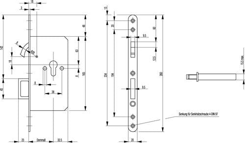- 1x BKS Zirkelriegelschloss Zirkelr./Springg.PZ silber rd 20x250mm