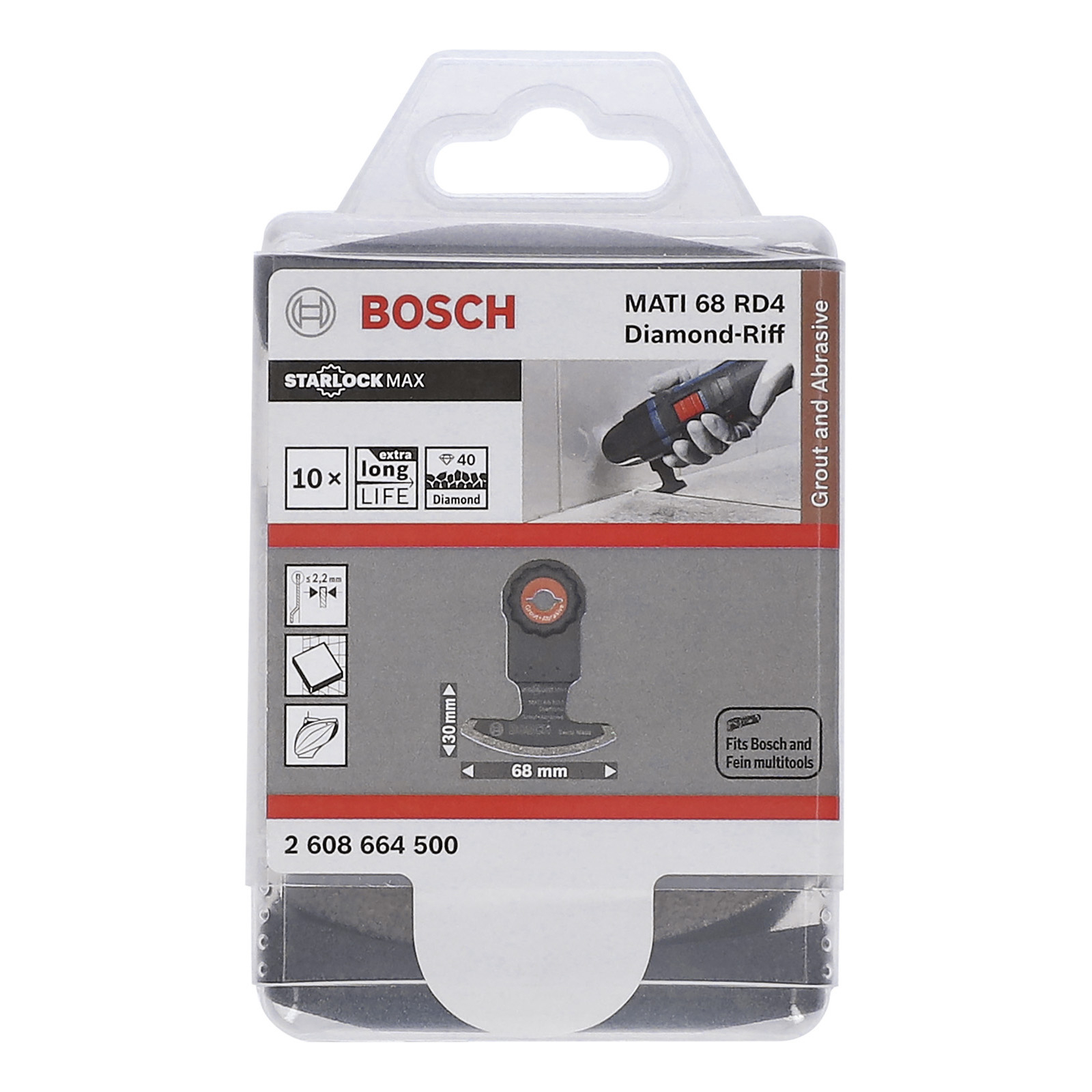 Blatt Starlock MATI 68 RD4 für besonders schnelles Ausfräsen von Fugenmörtel und abrasivem Material. Spitze Blattenden für schnelles Arbeiten selbst an schwer zugänglichen Stellen und in Ecken. Blattlänge 30 mm, erhöhte Reichweite in Fugen für tiefe Schnitte Hochwertiger Diamantbesatz Körnung 40 auf 68 mm breiter Schneidekante ermöglicht schnellen und effizienten Materialabtransport. Ermöglicht beim Ausfräsen von tiefen Fugen selbst an schwer zugänglichen Stellen perfekte Arbeitsergebnisse Dieses Blatt ist perfekt geeignet für das Ausfräsen von Porenbeton und weichem Backstein und das Anfertigen von Ausschnitten in weiche Wandfliesen. Auch für präzise Aussparungen in schwierige abrasive Materialien wie Zementfaserplatten und glasfaserverstärkte Verbundwerkstoffe geeignet Der robuste Diamantbesatz der Körnung 40 sorgt für maximale Verschleißresistenz und besonders lange Nutzungsdauer. Das System Starlock Max ermöglicht selbst bei härtestem Einsatz maximale Schnitttiefe, Geschwindigkeit und Vielseitigkeit. Das Starlock-Aufnahmesystem ermöglicht einen schnellen Blattwechsel ohne Blattberührung in drei Sekunden. Das Starlock-Aufnahmesystem ermöglicht durch seine dreidimensionale enge Passung maximale Kraftübertragung zwischen Maschine und Zubehör. Kompatibel sind alle Elektrowerkzeuge des Typs Starlock Max.