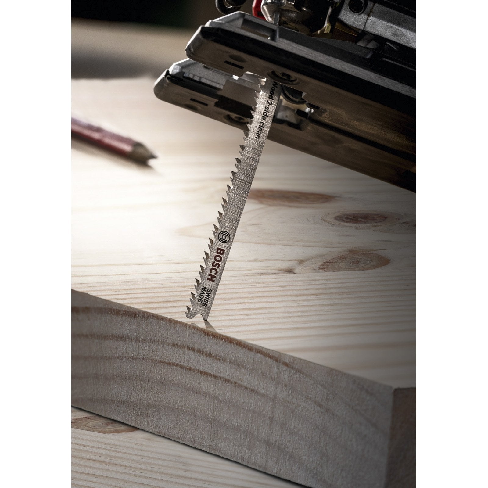 Mit seinen besonders scharfen, präzisionsgeschliffenen Zähnen eignet sich das Bosch Expert ‘Wood 2-side clean’ Stichsägeblatt gut zum Schneiden von Weichholz mit einer Dicke von bis zu 50 mm. Möbelschreiner können ein perfektes Ergebnis erzielen und verlieren nicht nach jedem Stichsägenschnitt Zeit durch Schleifen. Erhältlich für gerade Schnitte (T308B), für Kurvenschnitte (T308BO) und für genaue Winkelschnitte (T308BP)