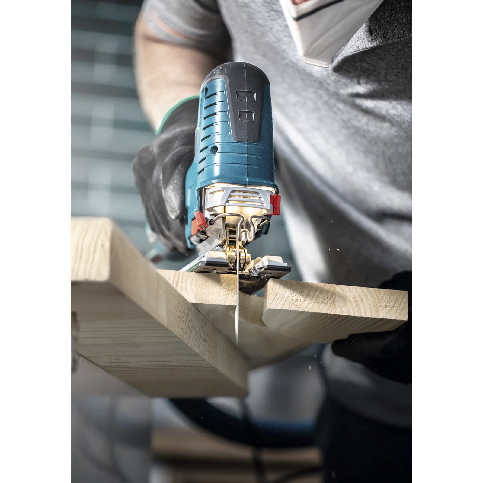 - Ideal für ausrissfreie Kurvenschnitte. Schneidet Massivholz bis zu 50 mm, zum Beispiel zum Fertigen von Möbeln ohne Schleifen.