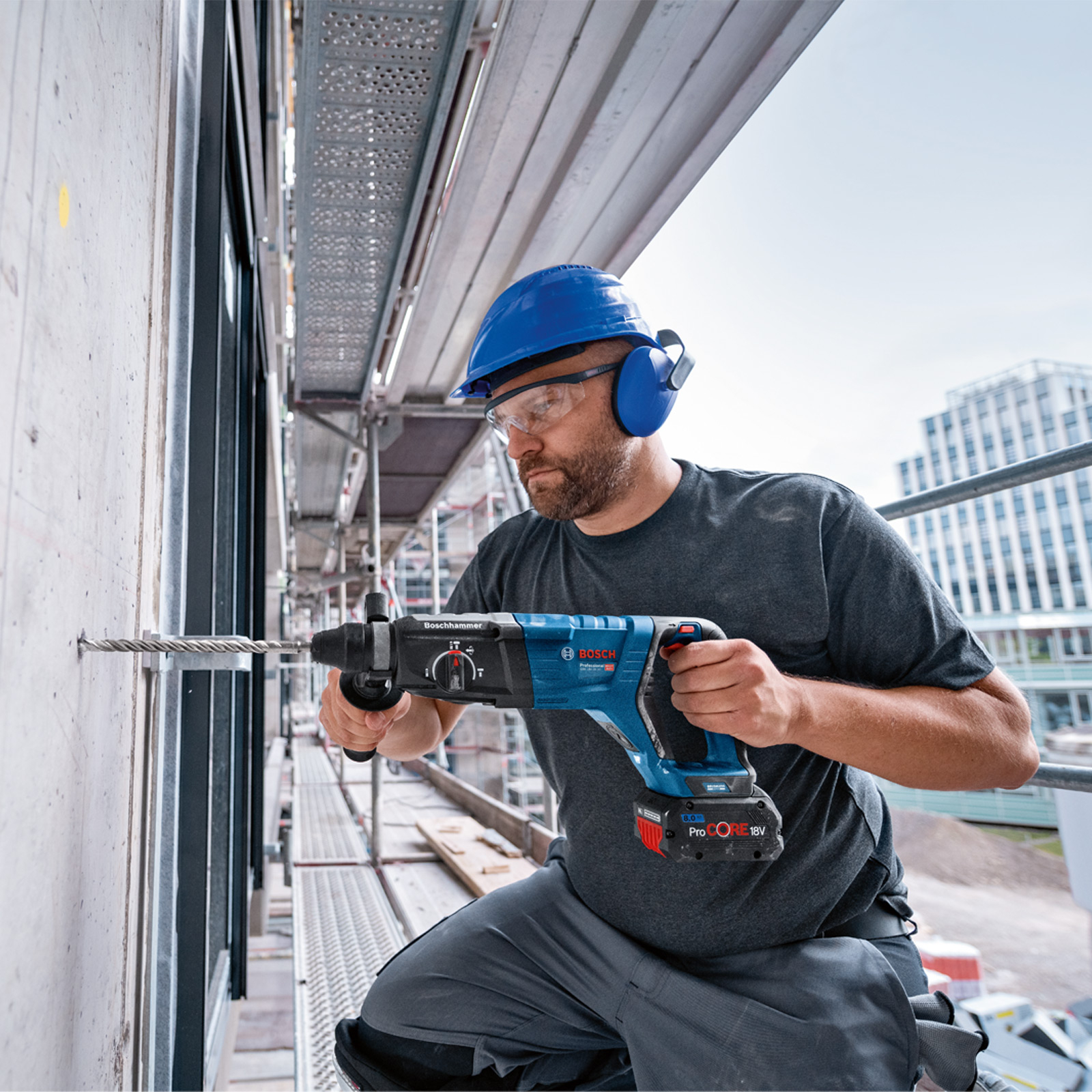 - Kabelfreie, stärkere Leistung als beim kabelgebundenen GBH 2-28; bürstenloser Motor liefert 3,4 J Schlagenergie und ein Leistungs-Gewichtsverhältnis von 1,1 J/kg