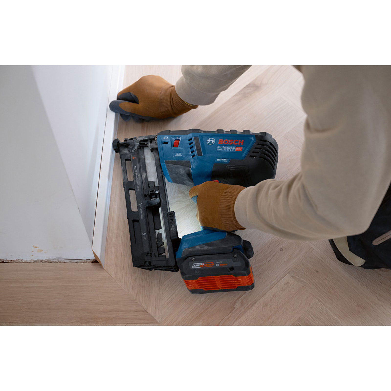 Akku-Holznagler GNH 18V-64-2 M, Als professioneller Handwerker willst du Nägel effizient und ohne zu große Belastung für Hand und Arm eintreiben. Wir haben den leistungsstarken, bürstenlosen GNH 18V-64-2 M Professional mit einem sehr geringen Rückschlag entwickelt, der dein Handgelenk schont. Außerdem haben wir darauf geachtet, dass du das Werkzeug einhändig einschalten und bedienen kannst. Dieses Werkzeug bietet die volle Leistung eines Druckluftnaglers, aber frei von Kompressor, Gaskartusche oder Kabel. Ideal für die Montage von Fenster- und Türrahmen, Kronenleisten, Balustern an Treppengeländern, Decken- und Bodenplatten mit Nut- und Federverbindung (verdeckte Nagelung), Täfelungen und Sockelleisten. Kompatibel mit dem Bosch Professional 18V System und mit der markenübergreifenden AMPShare Akku-Allianz. Mit einhändig bedienbarem Ein-/Aus-Schalter, HMI mit Service-Warnung, Einzel- und Serienauslösung, benutzerfreundlicher stufenloser Tiefenverstellung, Trockenschuss-Sperre, Doppel-LED, großem Sichtbereich an der Kontaktspitze, werkzeugloser Nagelstaubeseitigung. Geeignet für folgende Nägel: 32-64 mm, 16 ga (1,6 mm) und 20° Magazinwinkel. Karton