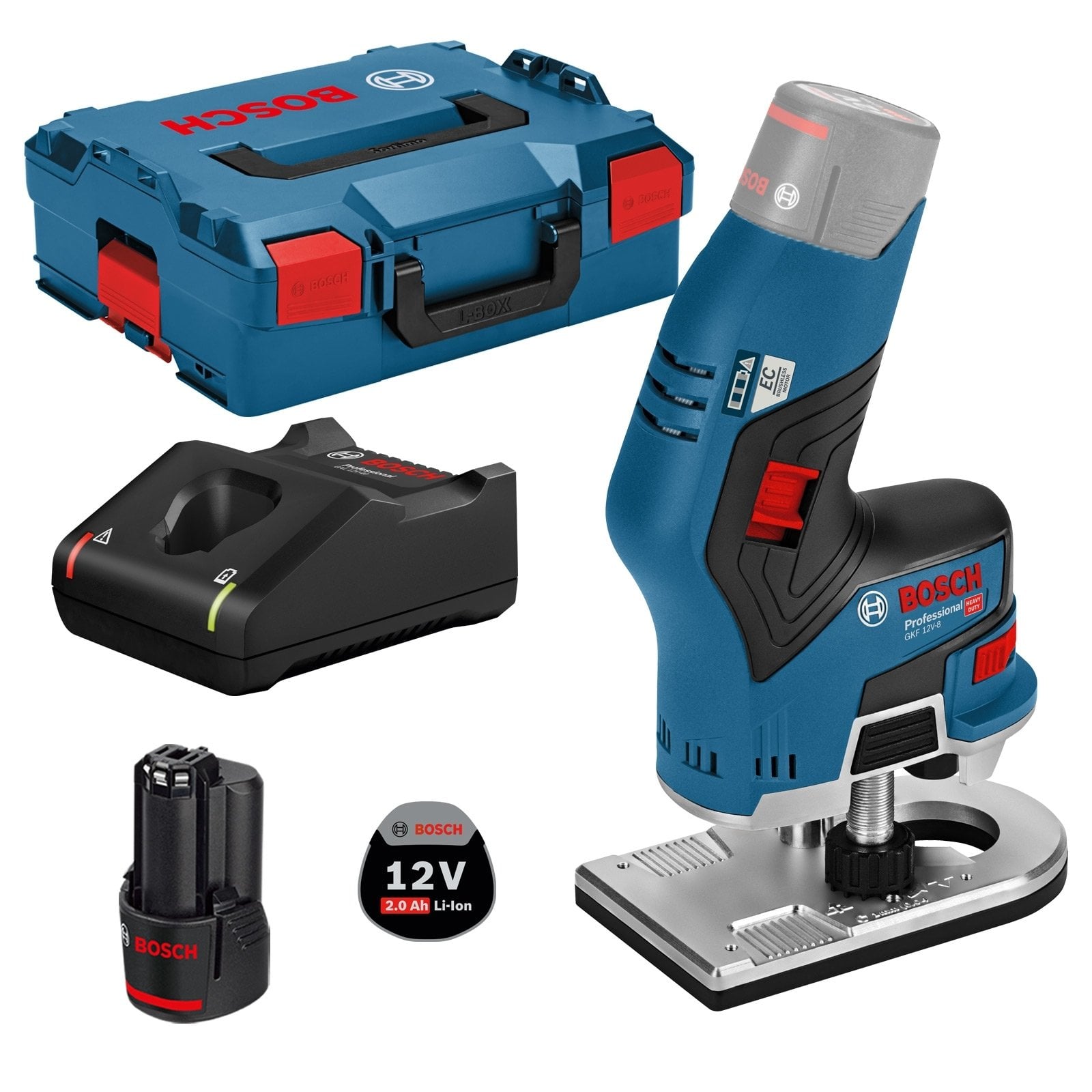 "Bosch Akku-Kantenfräse GKF 12V-8 12 V / 1x 2,0 Ah Akku + Ladegerät inkl. 2x Fräser in L-Boxx"