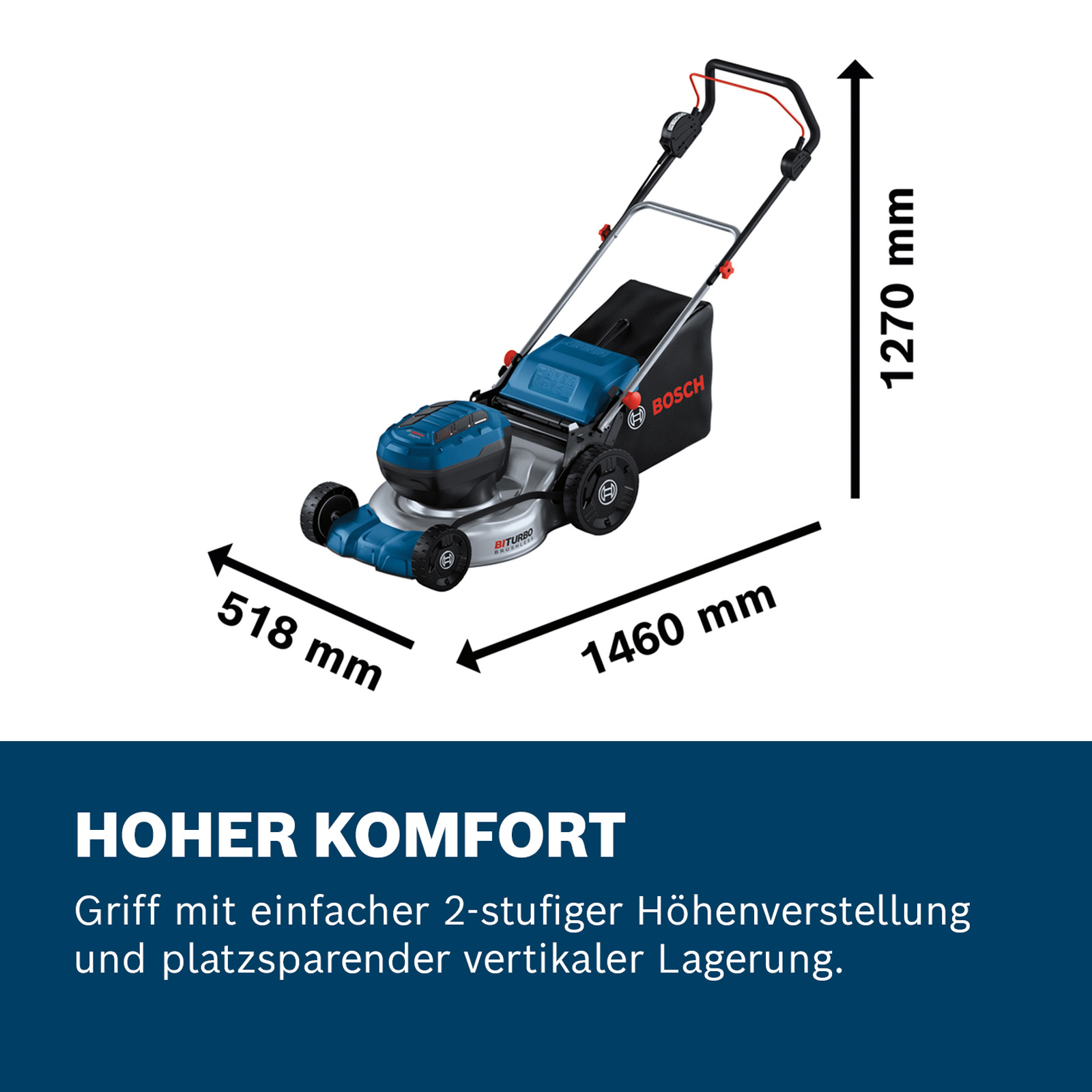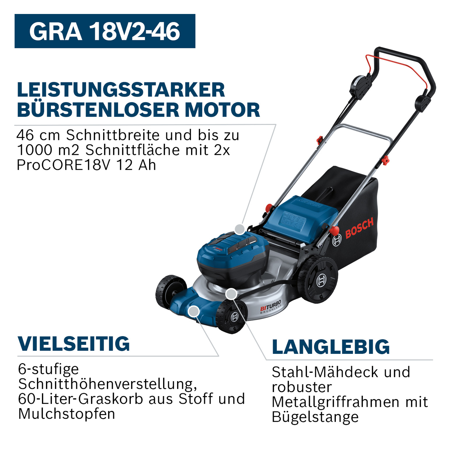 Wir haben den kabellosen GRA 18V2-46 Professional mit BITURBO-Technologie als kraftvollen und zuverlässigen Mäher für deinen Rasen entwickelt – alles im Rahmen des Bosch Professional 18V Systems. Sein starker bürstenloser Motor läuft mit zwei 18V-Akkus und sorgt für hohe Leistung, längere Laufzeit und eine lange Lebensdauer. Der klappbare Handgriff erlaubt ein kompaktes Zusammenklappen des Mähers für einen leichten Transport und eine problemlose Lagerung, sogar in senkrechter Position. Sein ergonomischer Griff mit Softgrip und 2-stufiger Höheneinstellung unterstützt eine gesündere Körperhaltung und macht deine Arbeit bequemer. Der Rasenmäher hat einen Schnittdurchmesser von 46 cm und bietet eine 6-stufige Schnitthöheneinstellung von 30 bis 70 mm. Das Stahl-Mähdeck des Mähers ist extrem robust; es hält höhere Lasten aus und trägt zu einer längeren Lebensdauer bei. Sein 60-Liter Textilgrasfangkorb und der Mulchstopfen geben dir die Flexibilität, entweder deinen Grasschnitt zu sammeln oder ihn als natürlichen Dünger für deinen Rasen zu nutzen. Kompatibel mit dem Bosch Professional 18V System und mit der markenübergreifenden AMPShare Akku-Allianz. Der Rasenmäher wird sowohl mit einem Mulchstopfen als auch einem 60-Liter-Textilgrasfangkorb geliefert.