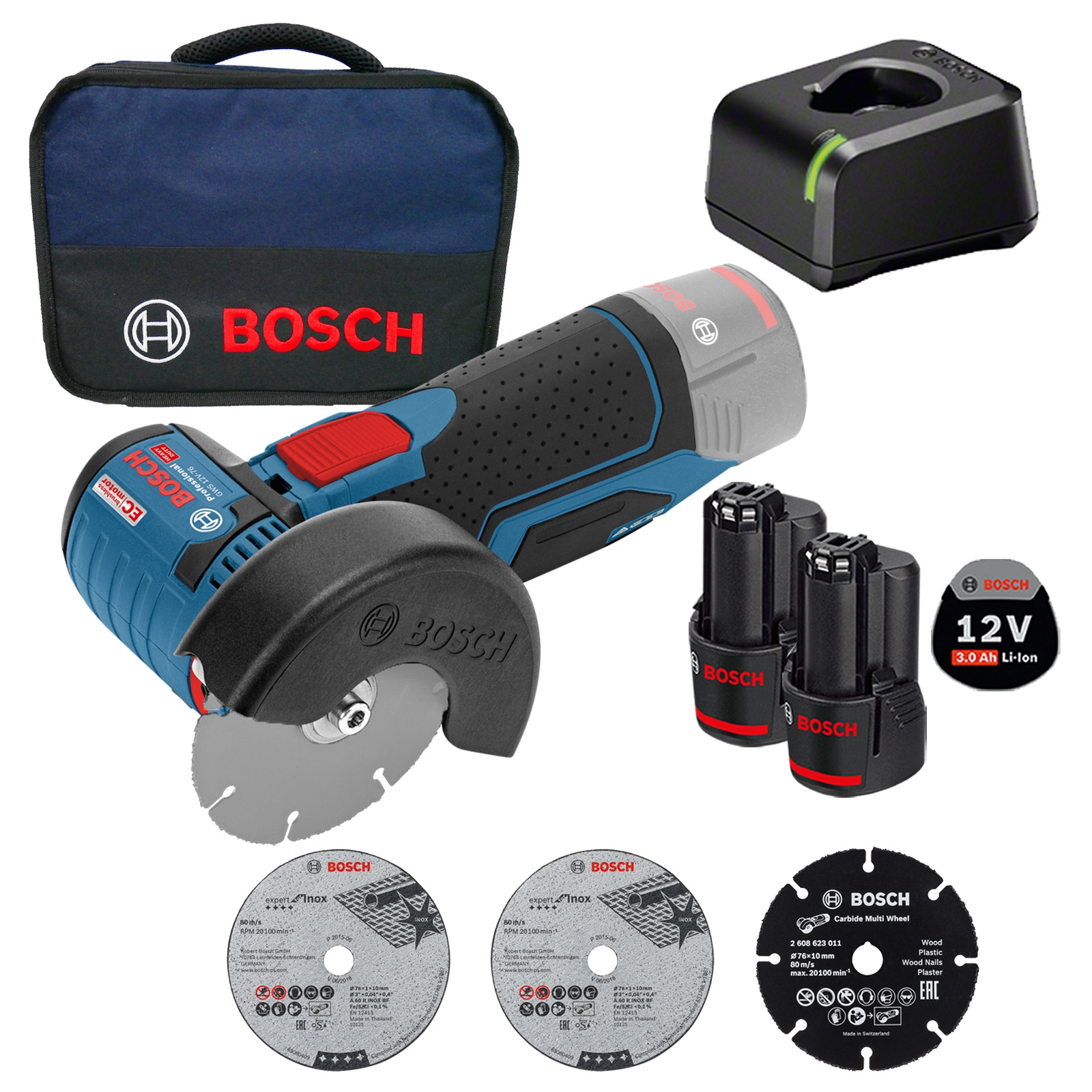 "Bosch Akku-Winkelschleifer GWS 12V-76 Ø 76 mm / 2x 3,0 Ah Akku + Ladegerät im Softbag"