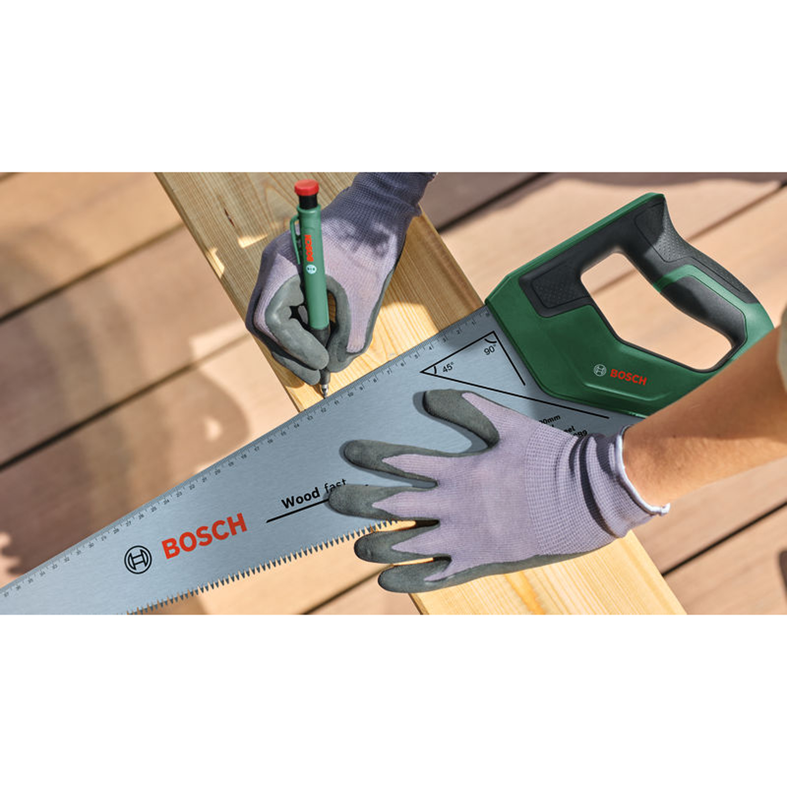 Handwerkzeuge Handsäge 450 mm. Ergonomische Handsäge für feine Schnitte und hervorragende Ergebnisse beim Heimwerken. Ergonomisches Design mit Softgrip-Griff für optimale Kraft und Kontrolle. Universal-Sägeblatt mit 450 mm Länge aus robustem SK5-Stahl mit 11 TPI für feine Schnitte in allen Holzarten. Überlegene Leistung und lange Lebensdauer dank induktiv gehärteten, dreifach geschliffenen, ultrascharfen 3-PT-Zähnen. Praktische Längenmessung und Markierung mit einzigartiger, rückwärtslaufender metrischer 35-cm-Skala. Integrierte 45°- und 90°-Winkelmarkierungsführung im vorderen Griff. Inklusive wiederverwendbarem massivem Sägeblattschutz mit aufsteckbarem Scharnier. 1 x Sägeblattschutz