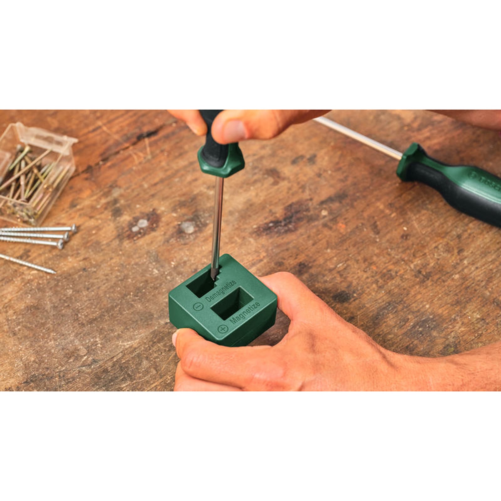 Handwerkzeuge Magnetisierer/Entmagnetisierer. Praktischer Magnetisierer/Entmagnetisierer für einfachere Schraubenhandhabung. Ideal für den Einsatz mit Schraubendrehern und Bits für mehr Effizienz und Einfachheit. Schnelles und einfaches Magnetisieren und Entmagnetisieren. Zwei starke Ferritmagnete, die dafür sorgen, dass Schrauben an magnetisierten Schraubendrehern haften. Kompaktes Design und geringes Gewicht für leichte Handhabung. Intuitive Anwendung dank selbsterklärender Symbole