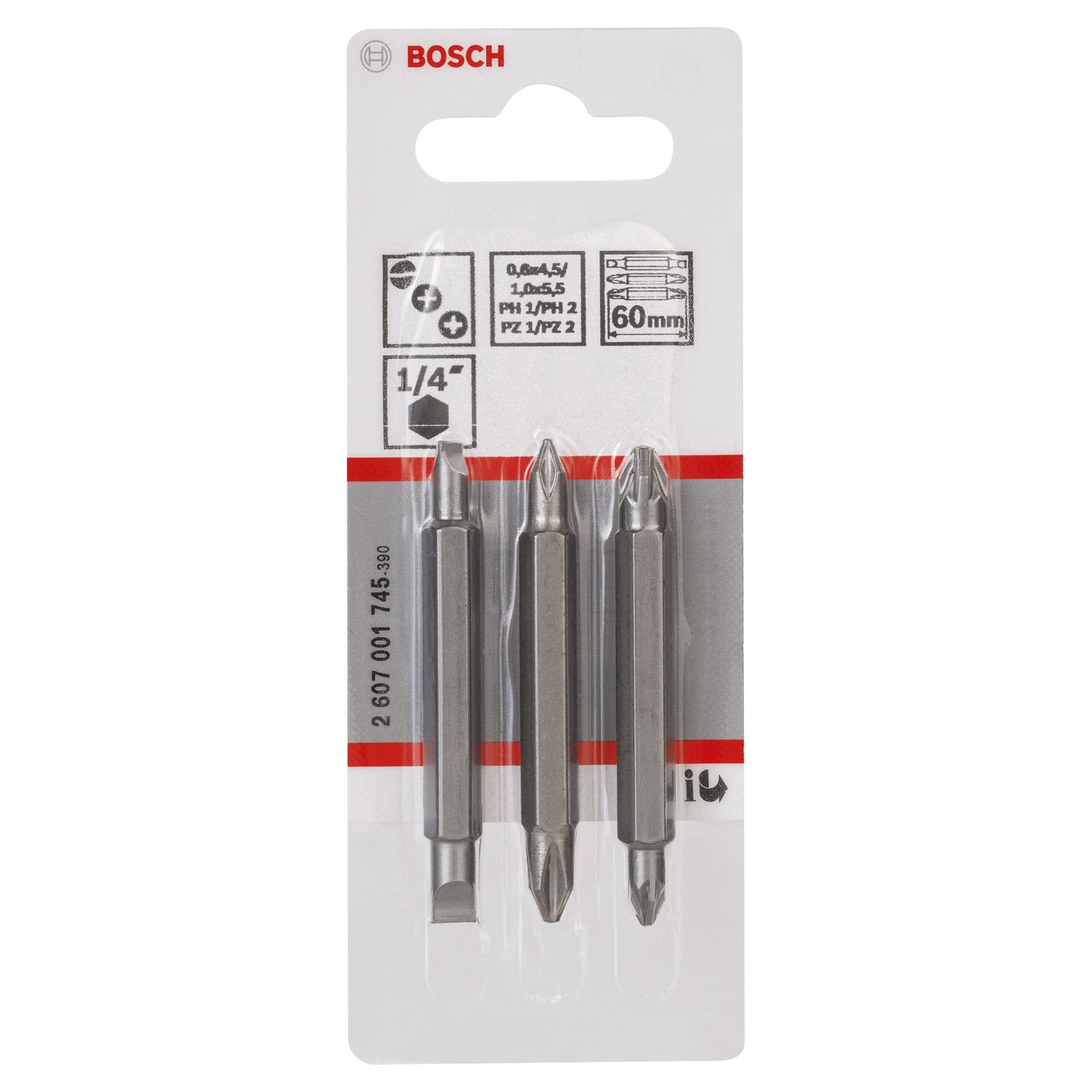 "Bosch Doppelklingen-Set, 3tlg. PH1, PZ1, S 0,6x4,5, PH2, PZ2, S1,0x5,5, 60 mm - 2607001745"
