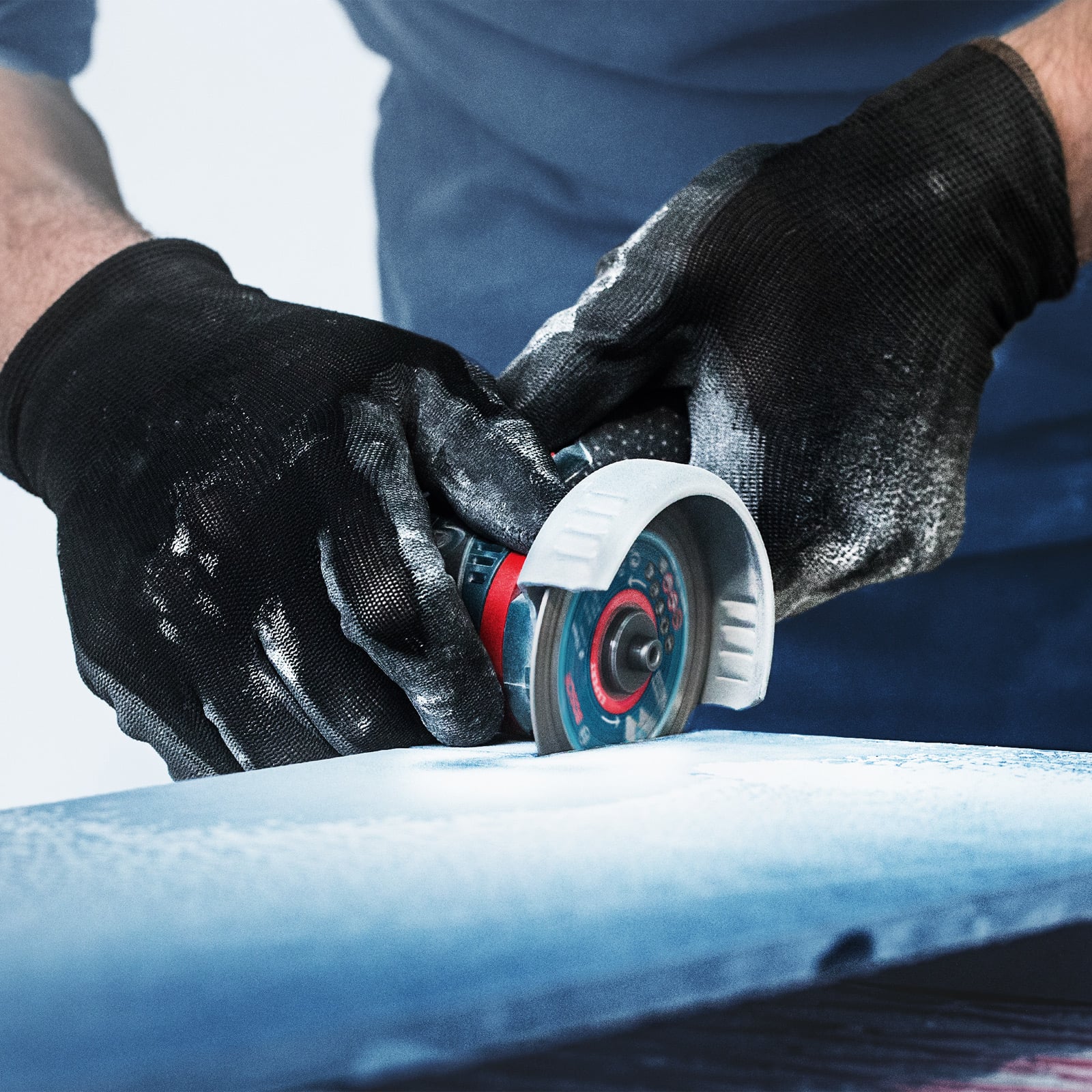 Bei der Diamond Technology von Bosch werden ständig neue Diamanten an die Oberfläche gebracht, um sicherzustellen, dass der Rand immer scharf ist. So kann unsere Trennscheibe glatt selbst durch harte Fliesen schneiden. Der schlanke, starke Körper und der kontinuierlich geriffelte Rand bieten maximale Kontrolle und verringern Vibrationen – für hochwertiges spanfreies Schneiden.