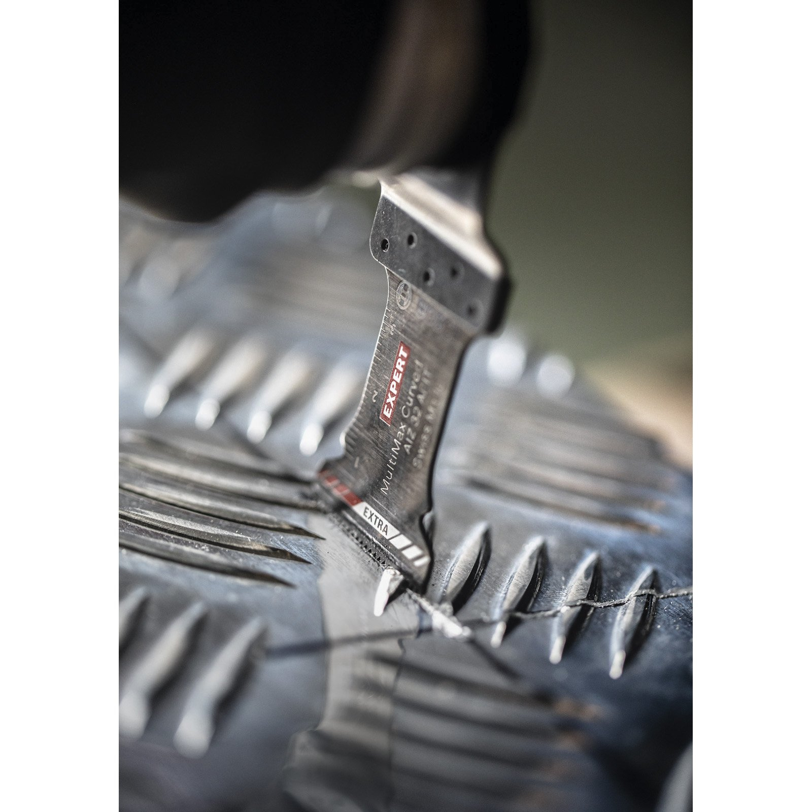 Die Curved-Tec-Blätter von Bosch überzeugen dank ihrer Fähigkeit, saubere Tauchschnitte und schwierige Schnitte auf hohem Niveau zu ermöglichen. Mit dem Bosch Expert MultiMax Blatt für Multifunktionswerkzeuge kannst du diese Fähigkeit für Tauchschnitte auf die härtesten Materialien wie Blech, Kohlefaser und roten Backstein übertragen.
