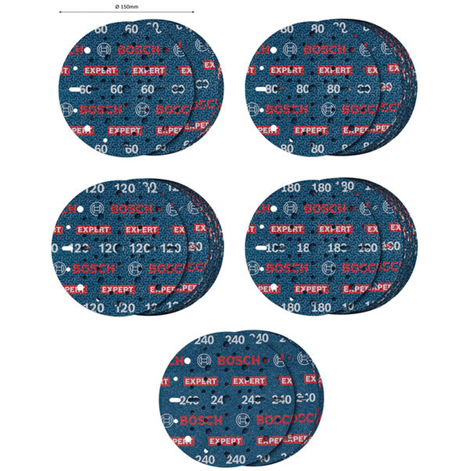 "Bosch EXPERT O780 Folienschleifscheiben-Set 150 mm G60 G80 G120 G180 G240 55tlg - 2608902470"