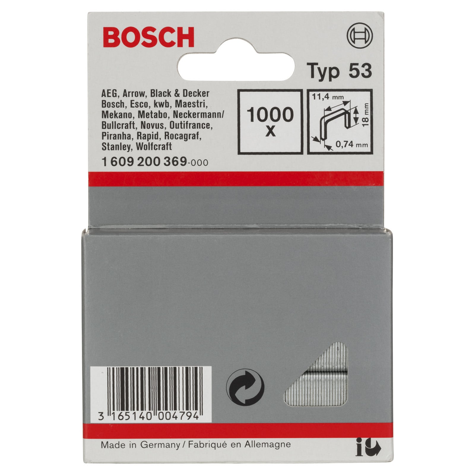"Bosch 1.000x Feindrahtklammer Typ 53, 11,4 x 0,74 x 18 mm -1609200369"