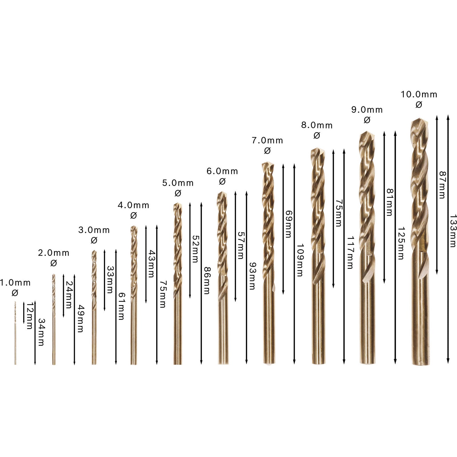 - Nach DIN 338 gefertigt, Bohrertyp N (kleiner Seitenspanwinkel) mit Spitzenwinkel 135 Grad und Durchmessertoleranz h8