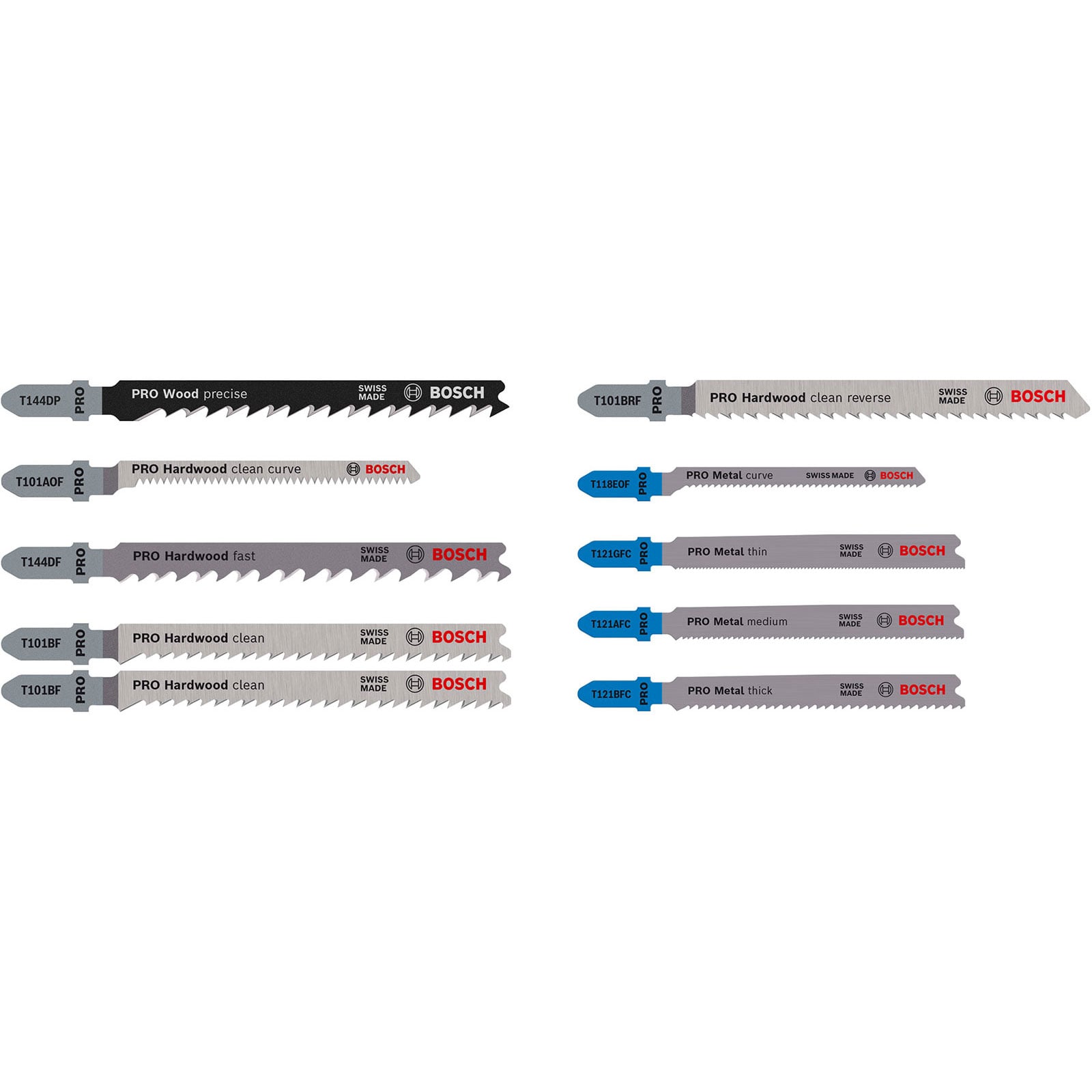 - Das PRO Wood and Metal Set beinhaltet Stichsägeblätter aus BI-Metall: Sie verfügen über eine Zahnleiste aus Schnellarbeitsstahl (HSS), die mit einem Körper aus Kohlenstoffstahl (HCS) verbunden ist, um die notwendige Stabilität und Haltbarkeit zu erreichen.