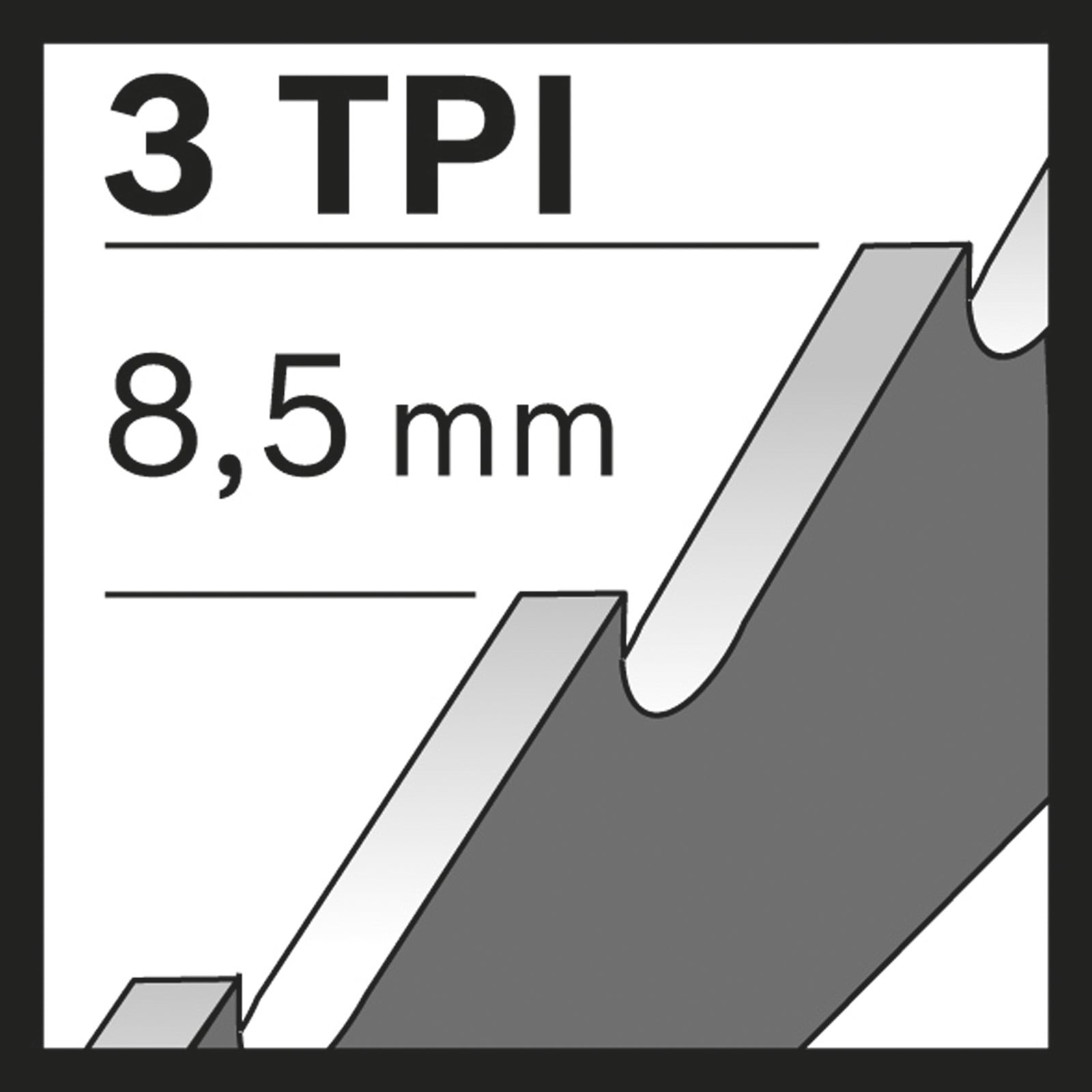 - Die sehr lange Zahnteilung (8,5 mm) und die geschränkten Zähne bieten schnelle Schneideergebnisse, während die dicke Blattstärke (1,25 mm) für hohe Stabilität sorgt.