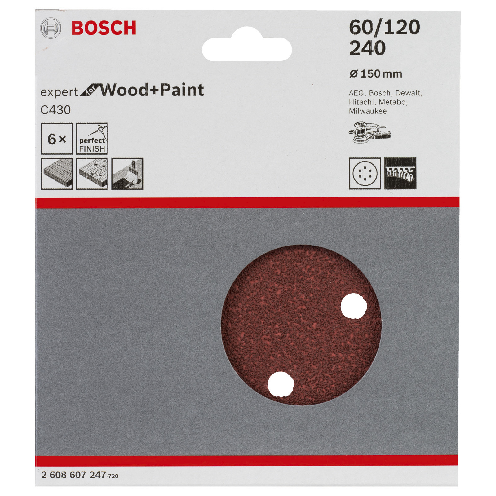 - 6x Bosch Schleifblatt Expert for Wood, 6 Löcher, 150 mm, 60, 120, 240 -2608607247