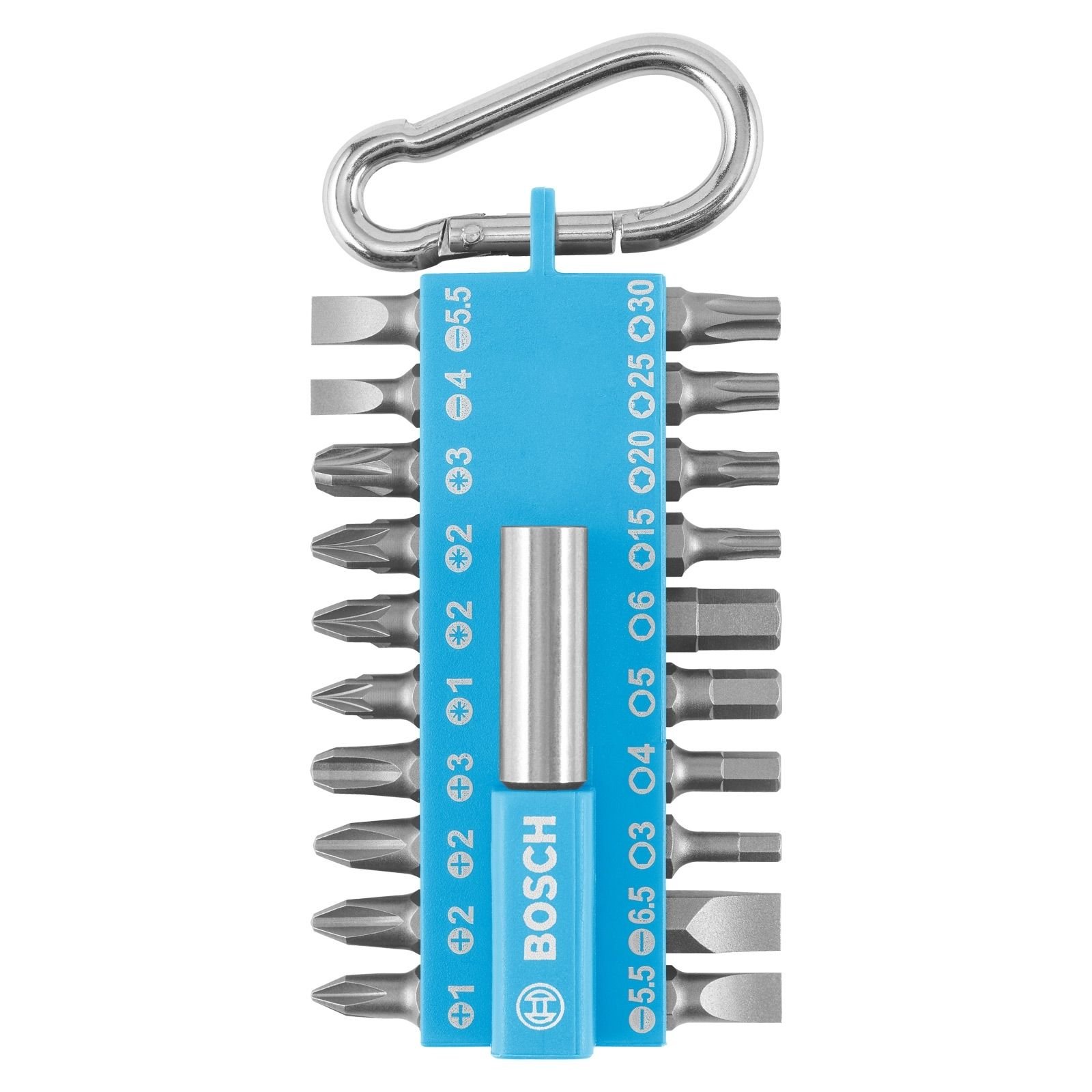 - 1x Bosch Schrauberbit-Set 21tlg. mit Snap-hook (hellgrün) bestehend aus: PZ1, PZ2 (2x), PZ3, PH1, PH2 (2x), PH3, T15, T20, T25, T30, SL4, SL5.5, SL5.5, SL6.5, H3, H4, H5, H6, Universalhalter, magnetisch