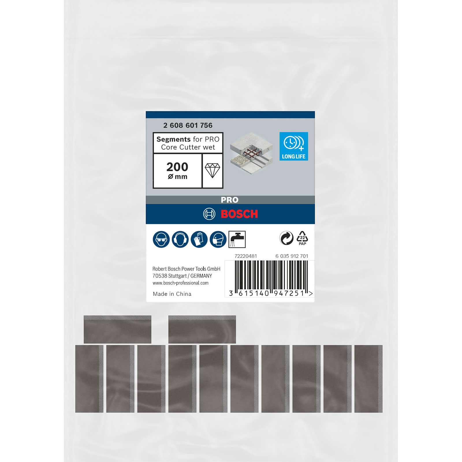 - Segmente bieten durch einen hochwertigen Diamantbesatz und eine gleichmäßige Kornverteilung einen schnellen Arbeitsfortschritt.