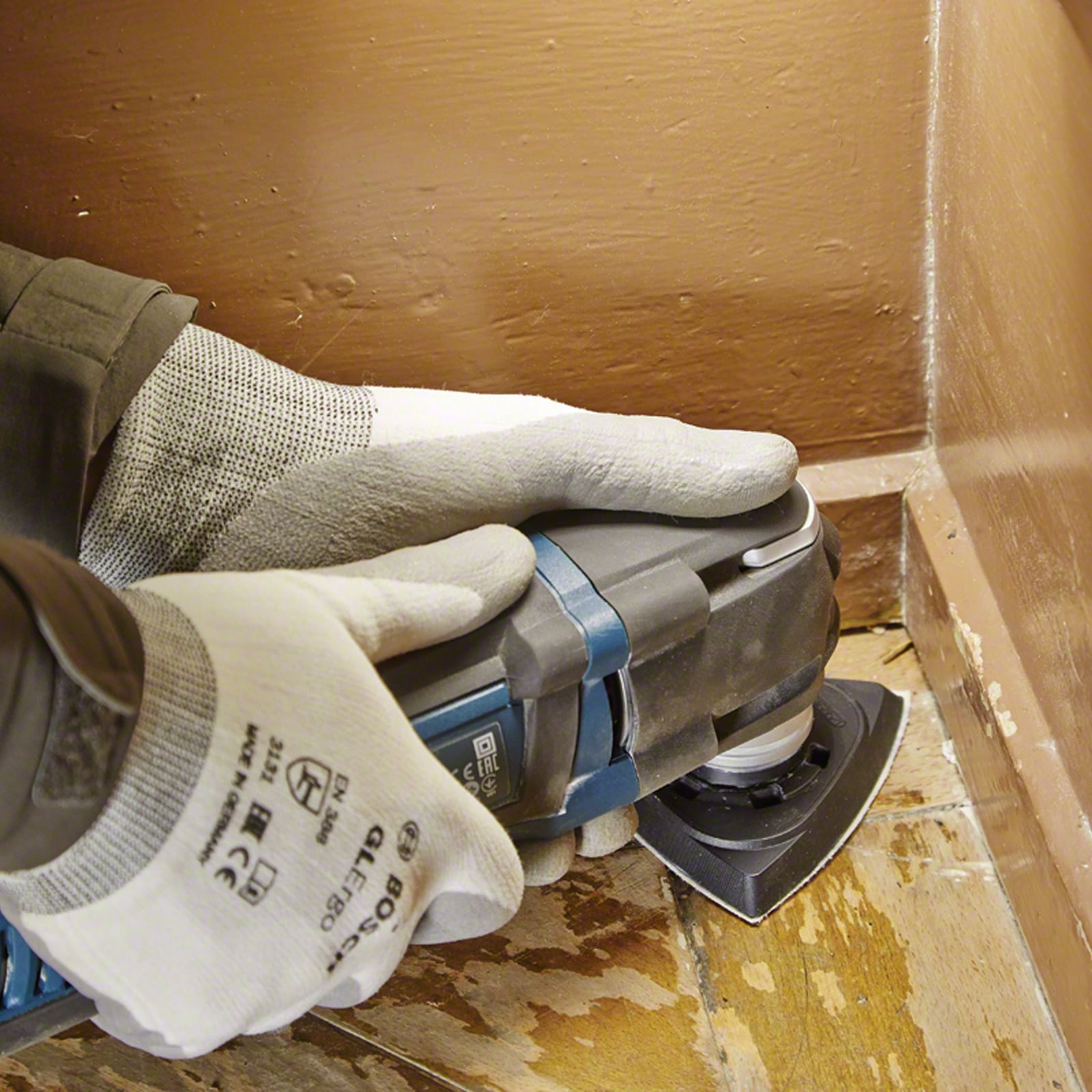 Die Schleifplatte Starlock AVZ 93 G für komfortables und rückschlagfreies Schleifen in Ecken. Dieses einzigartige Design mit flexiblen Ecken und optimierter Shore-Härte der Platte beugt dem Verschleiß oder dem Verschmelzen des Velours mit dem Blatt vor. Ein Klettverschluss-Befestigungssystem und das Velours ermöglichen einfachen Blattwechsel und den Einsatz einer großen Auswahl von Delta-Schleifpapieren. Besonders ausgelegte Extraktionsöffnungen sorgen für einen staubfreien und ablagerungsfreien schnellen Materialabtransport. Diverse zur Auswahl stehende Blattsätze und Polierpads ermöglichen optimales Abschleifen, Aufarbeiten und Polieren von Holz, Farbe, Lack und faserverstärkten Verbundwerkstoffen. Die Delta- oder Dreiecksausführung der Platte ermöglicht Arbeiten an schwer zugänglichen Stellen, wie etwa in Ecken. Das Starlock-Aufnahmesystem ermöglicht durch seine dreidimensionale enge Passung maximale Kraftübertragung zwischen Maschine und Zubehör. Das Blatt ist kompatibel mit allen Elektrowerkzeugen des Typs Starlock, Starlock Plus und Starlock Max sowie allen gängigen Multifunktionswerkzeugen.