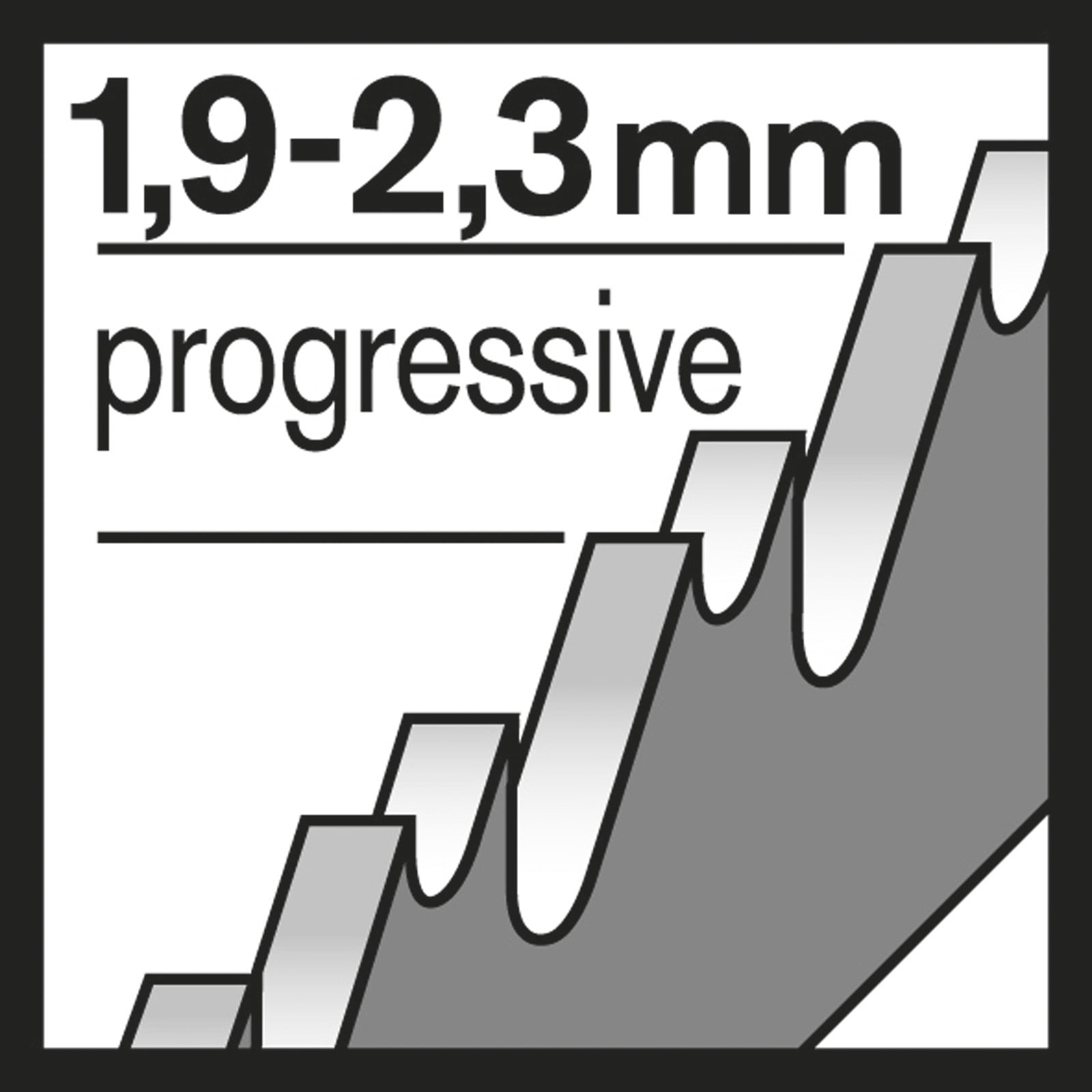 - Feine Zahnteilung (1,9-2,3 mm) ermöglicht es, eine Vielzahl an mittelstarken Metallblechen (2,5-6 mm) zu schneiden