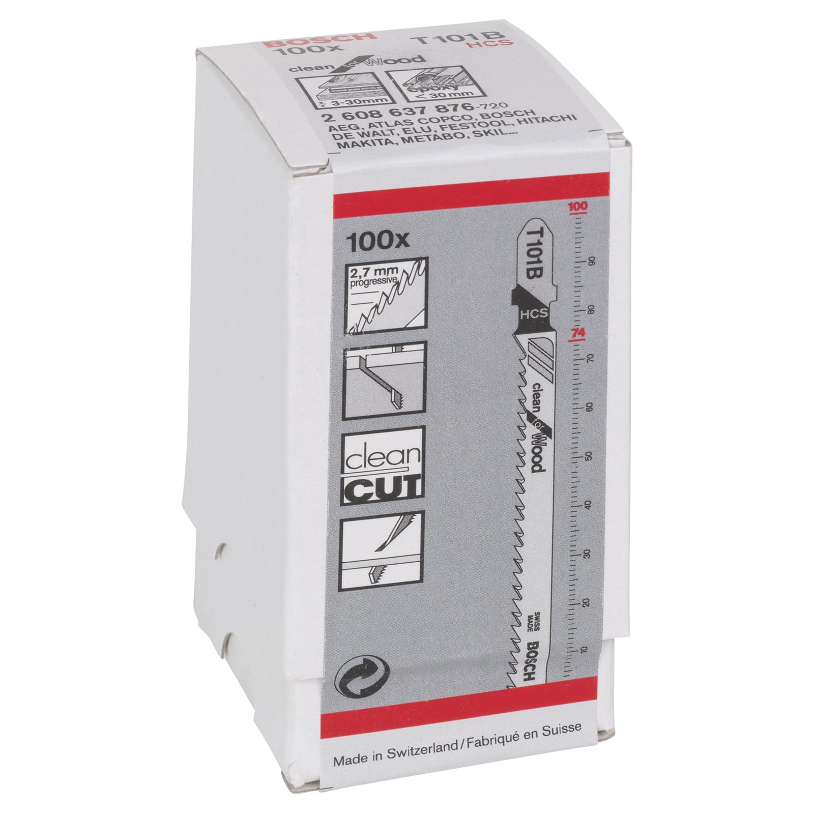 Für den Gebrauch mit Stichsägen mit T-Schaft-Aufnahme. Das T 101 B Clean for Wood Stichsägeblatt macht saubere gerade Schnitte in Holz. Die präzisionsgeschliffenen Zähne mit Kegelschliffkörper ermöglichen makellose Ergebnisse. Das Blatt aus Kohlenstoffstahl ist zum Schneiden von Weichholz und nicht-abrasiven Holzwerkstoffen geeignet. Es ist mit einer fein progressiven Zahnteilung (2,7 mm) ausgestattet, um Holzwerkstoffe mit einer Dicke von 3-30 mm zu schneiden.
