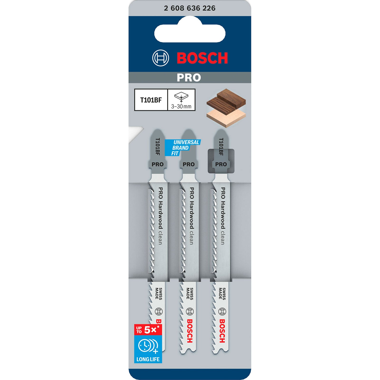 Für den Gebrauch mit Stichsägen mit T-Schaft-Aufnahme. Das T 101 BF Clean for Hard Wood Stichsägeblatt macht saubere gerade Schnitte in Holz. Die präzisionsgeschliffenen Zähne mit Kegelschliffkörper schneiden sauber. Die Zahnleiste aus gehärtetem HSS (Hochgeschwindigkeitsstahl) und BIM (Bimetall) ist mit hochelastischem HCS (Kohlenstoffstahl) verstärkt, wodurch das Blatt zum Schneiden von harten Materialien, wie Hartholz und abrasiven Holzwerkstoffen, geeignet ist. Es ist mit einer fein progressiven Zahnteilung (2,7 mm) ausgestattet, um eine Vielzahl an Holzmaterialien mit einer Dicke von 3-30 mm zu schneiden.